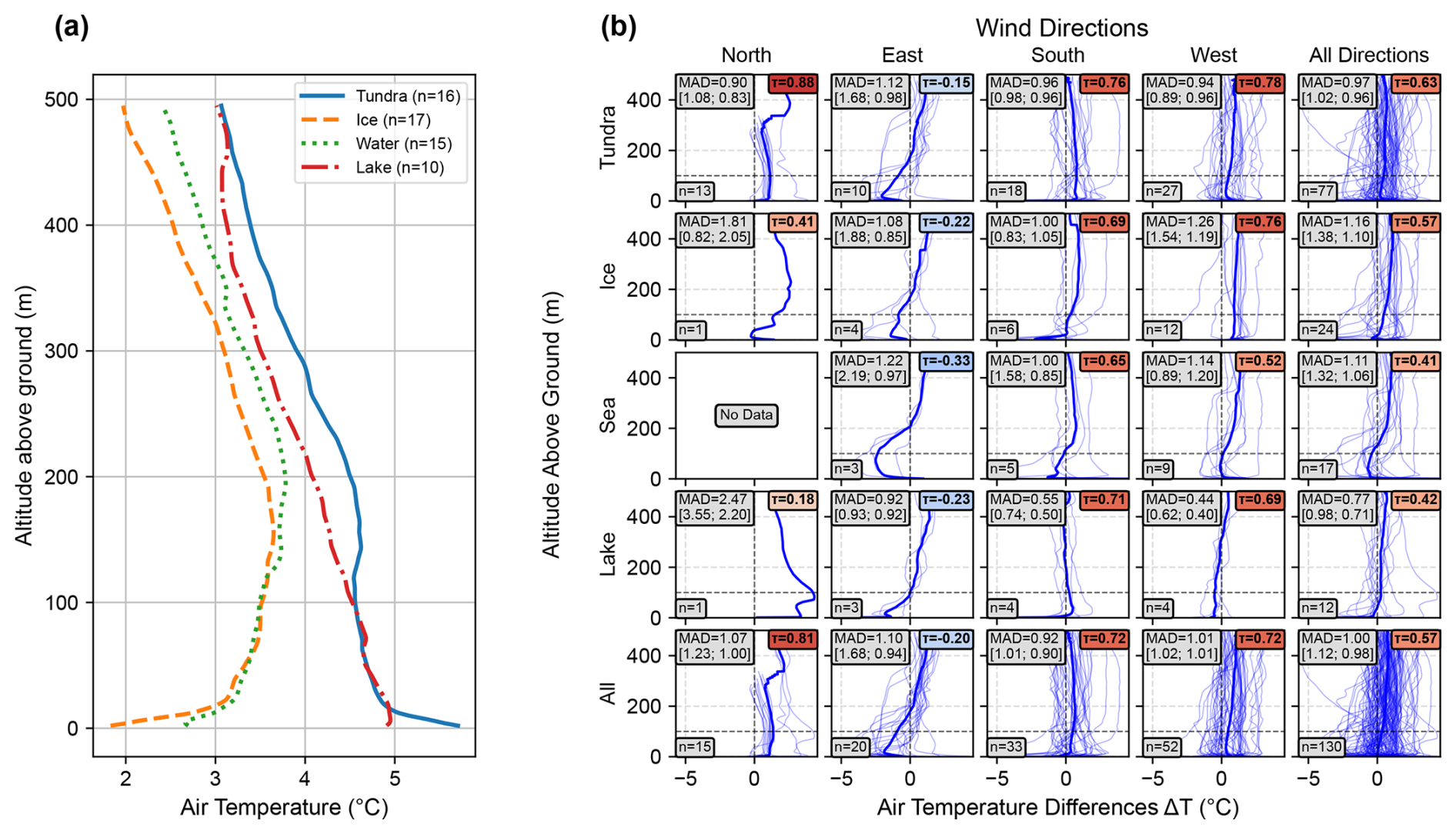 Figure 2(a) The average of those UAV air temperature profiles reaching from surface up to 495 m a.g.l. over different surface cover types and (b) air temperature differences (ΔT) between UAV and CARRA profiles grouped according to surface cover types (rows) and prevailing wind direction at the AWS (columns). Positive ΔT values indicate higher UAV-measured temperatures compared to CARRA. The thick blue lines show the mean ΔT, the thin lines individual profiles. 10 profiles could not be assigned to a wind direction due to gaps in the AWS data. Annotations show the mean absolute difference (MAD) between 0 and 500 m, and in square brackets the MAD below and above 100 m, respectively. The number of profiles (n) and Kendall's τ (τ) are also shown, with τ indicated by colour for clarity.