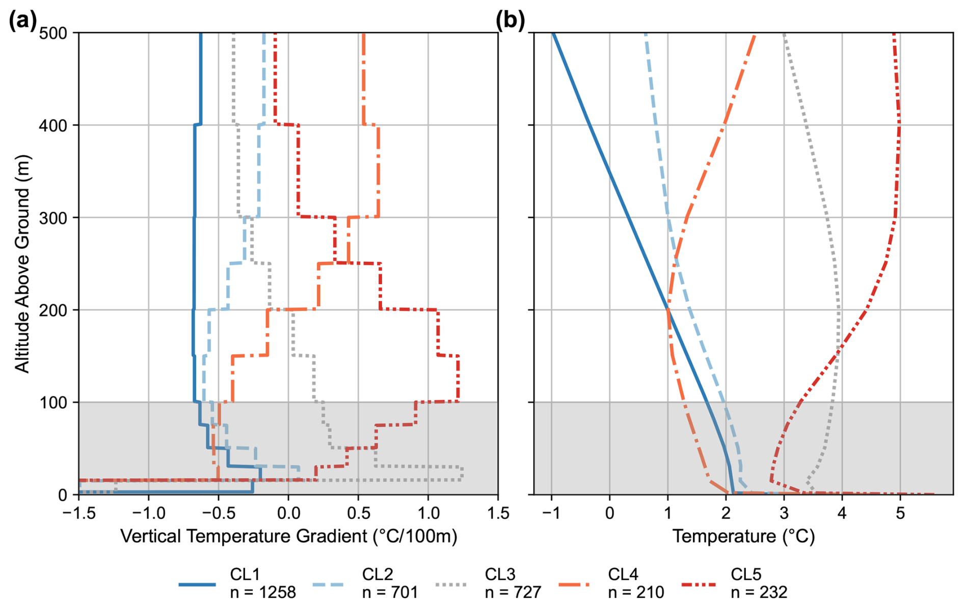 Figure 4(a) Vertical temperature gradient and (b) air temperature for each cluster mean in JJA between 1991 and 2024. The shaded grey area indicates the atmospheric layer excluded from clustering due to its strong sensitivity to the properties of the surface cover.