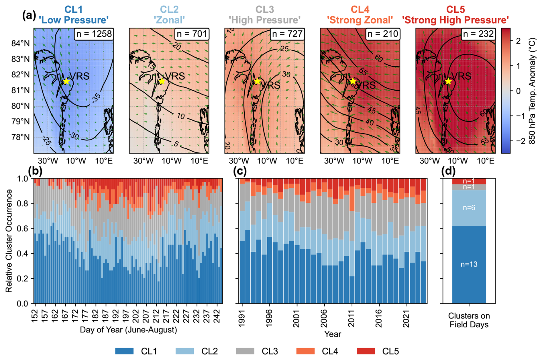 Figure 5(a) Synoptic conditions represented by the cluster means, their descriptive naming and absolute occurrence. Temperature anomaly (T_850) shown by colour, wind anomaly (W_850) by green vectors and 500 hPa geopotential height (Z_500) anomaly in m (contours) from ERA5 reanalysis; (b) relative cluster occurrences on the day of year within 1991 to 2024, (c) changes in relative cluster occurrence from 1991 to 2024, and (d) number of clusters on days of UAV field measurements (Field Days).
