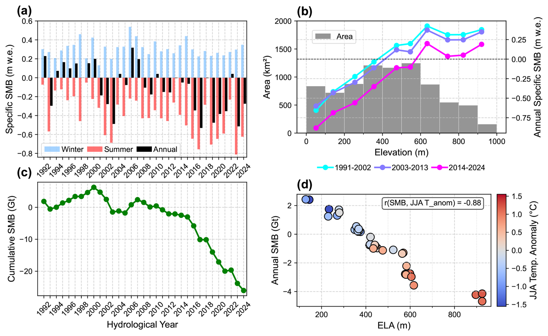 Figure 6(a) Specific SMB of FIIC for winter and summer and (c) cumulative SMB over the hydrological years from 1992 to 2024; (b) annual mean SMB for the time periods 1991–2002, 2003–2013 and 2014–2024 and glacier area averaged within each 100 m elevation bin; (d) annual SMB and inferred ELA together with mean 2 m air temperature anomalies (colours) over FIIC during JJA. The Pearson's correlation coefficient (r) of annual SMB and 2 m air temperatures is annotated in the diagram. The three dots marking the highest ELA and lowest SMB refer to the years 2017, 2019 and 2023.
