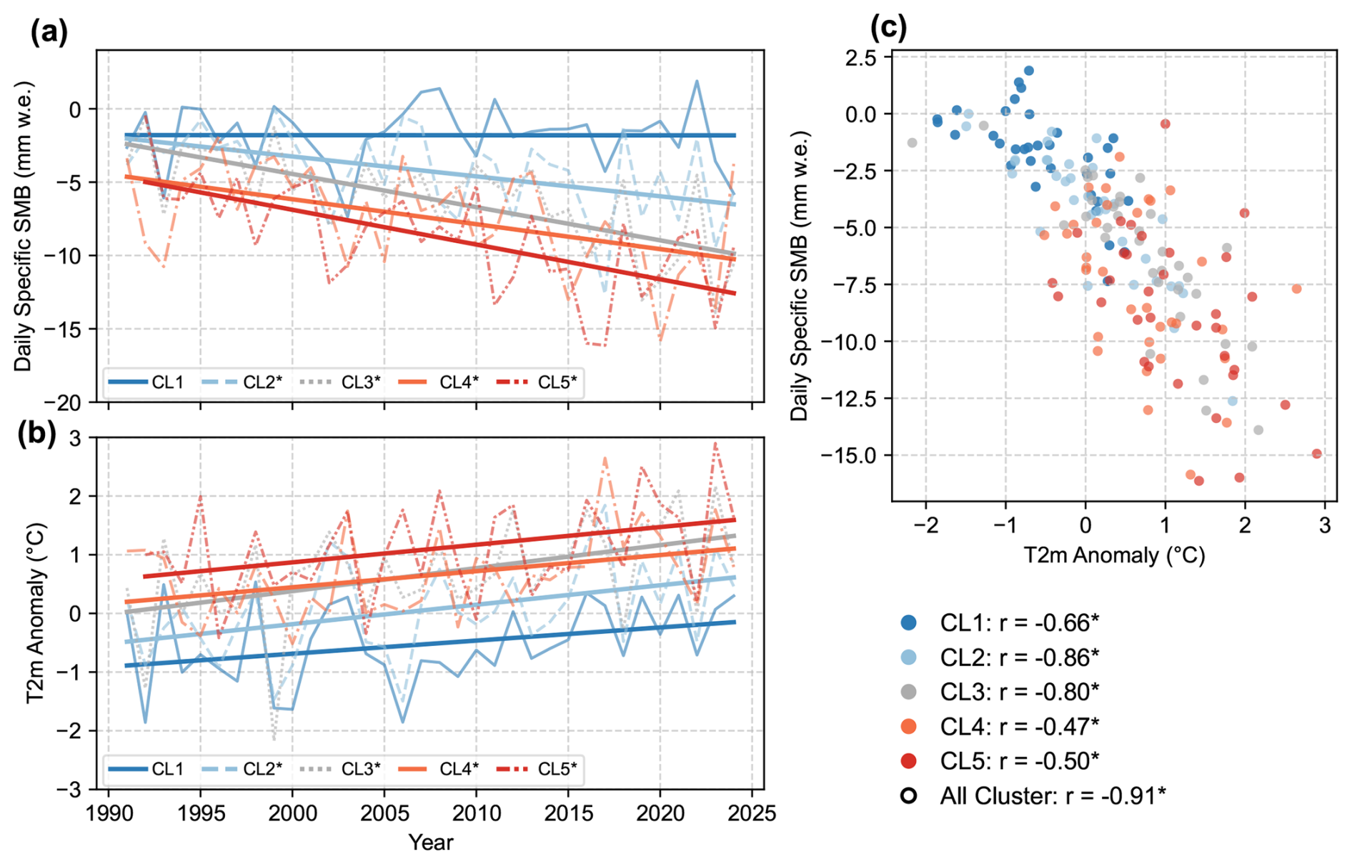 Figure 8(a) Daily average summer SMB of FIIC and (b) corresponding 2 m air temperature (T2m) anomalies, shown per cluster from 1991 to 2024. Linear trends are indicated by straight lines, with statistically significant trends (p<0.05) marked by asterisks in the legend; (c) daily average summer SMB and 2 m air temperature (T2m) anomaly per cluster. Pearson's correlation coefficients (r) are included in the legend with asterisks marking statistical significance (p<0.05).