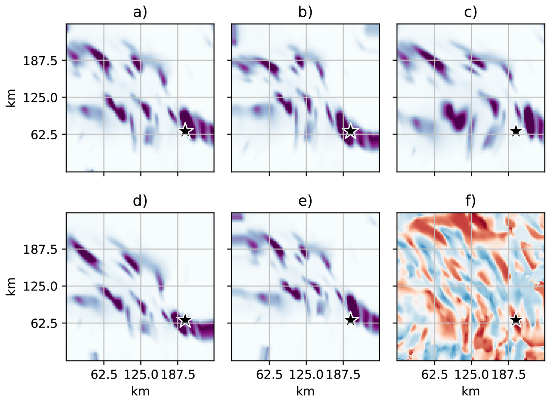 Figure 2Illustration of remapping. (a) shows original field (rain fall), (b–e) shows the ensemble members after remapping. (f) shows ensemble correlations between the point indicated by a star and the respective surrounding grid points.