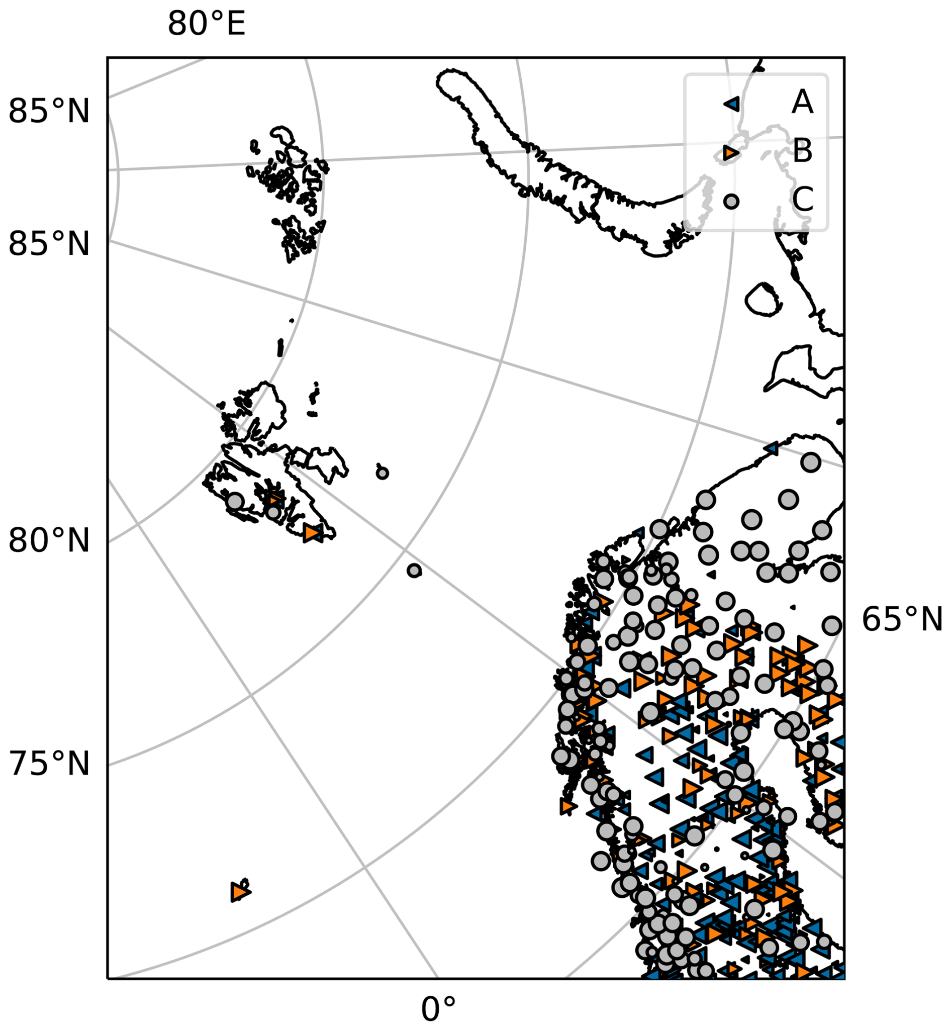 Figure 1Observations of snow depth only used in CARRA-Land-Pv1 (set A), only in CARRA (set B) and in both (set C) over the model domain. Marker size indicates the number of observations through the study period.