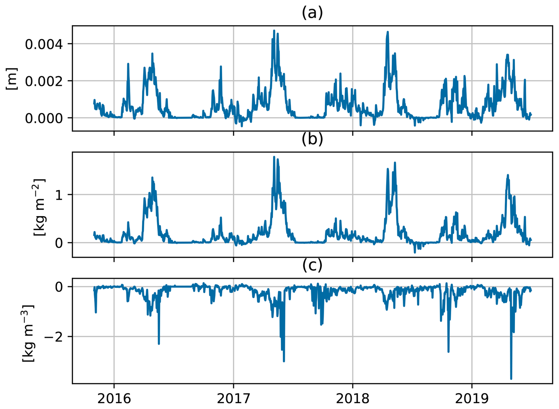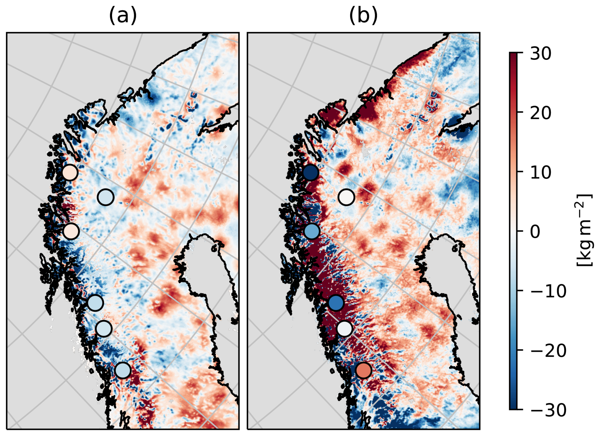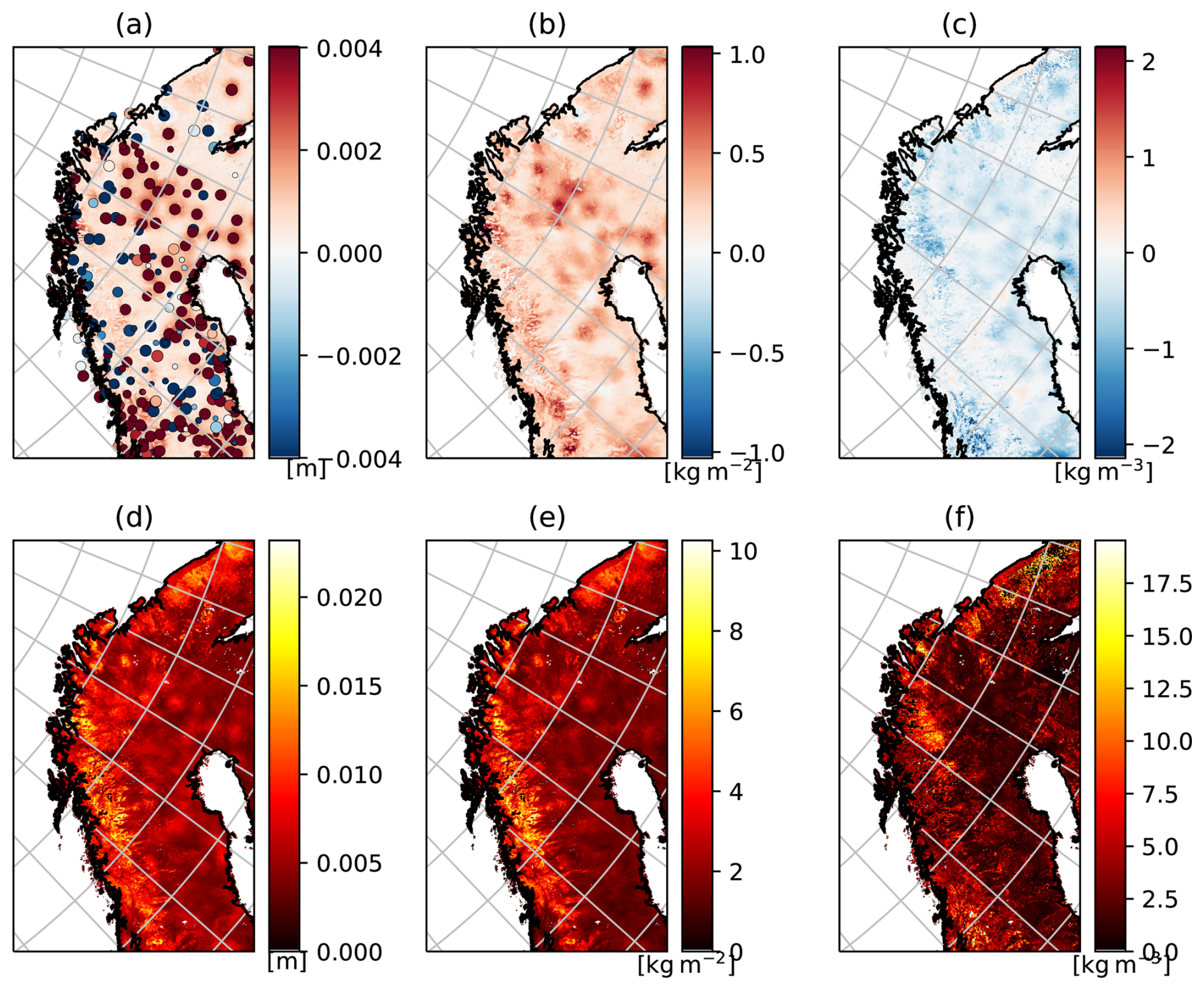 Figure 3 shows maps of the time averaged increments for snow depth δdtot (Fig. 3a), snow water equivalent δwtot (Fig. 3b), snow density δρtot (Fig. 3c) and their respective standard deviations in Fig. 3d–e. Snow depth and snow water equivalent increments are consistently positive over the domain, while snow density increments are mainly negative. The mean snow depth increments corresponds to several millimetres each day which roughly accumulates to a metre over 1 year. For snow water equivalent, about 200 mm of water is added each year through the increments. The time averaged snow depth innovations (yo-yb) are shown together with the average snow depth increments (Fig. 3a). Some observation sites are surrounded by increments with non-zero mean, particularly in the inland areas. The patterns of these increments are similar to the Gaussian localization function (Eq. 10) limiting the impact of the observations and shows the impacted area from each station. The systematic positive increments are related to positive innovations, indicating too little snow in the model. Similar patterns but with opposite sign are not seen around stations with negative innovations (indicating too much snow in the model). The stations with mean negative innovations are situated in mountainous areas and have small impact on the analysis. This is due too the large vertical distance between model and observation and thus the increment is dampened by the localization (not shown). For snow density, the stations are not as pronounced as for snow water equivalent and snow depth, and the largest values are found in mountain areas. The maps of standard deviations indicate larger increment magnitude over mountain areas for all variables, and smaller over the inland areas. Inland, the pattern around stations seen in mean increments are not as strong, indicating that the areas suffer from a systematic underestimation. On the other hand, the mountain regions are more exposed to random errors which cause larger increments, but with less systematic signal. The standard deviations of snow density increments (Fig. 3f) show fine spatial structure compared to the smoother snow water equivalent (Fig. 3e). This suggests that the topography and thus temperature forcing might play a bigger role than precipitation for the density uncertainty.