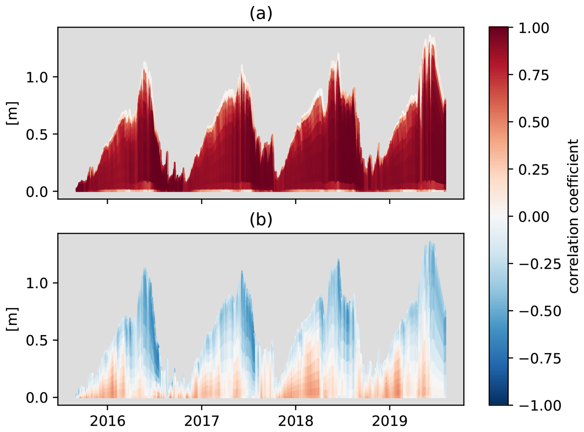 Figure 5Time series of domain average ensemble-mean snow depth dtot with colour-contoured ensemble correlations between total snow depth dtot and snow water equivalent wi (a) and between dtot and snow density ρi (b) per model level using Eq. (12). Only grid points with snow are used, thus the depth is only representative for snow covered grid cells.