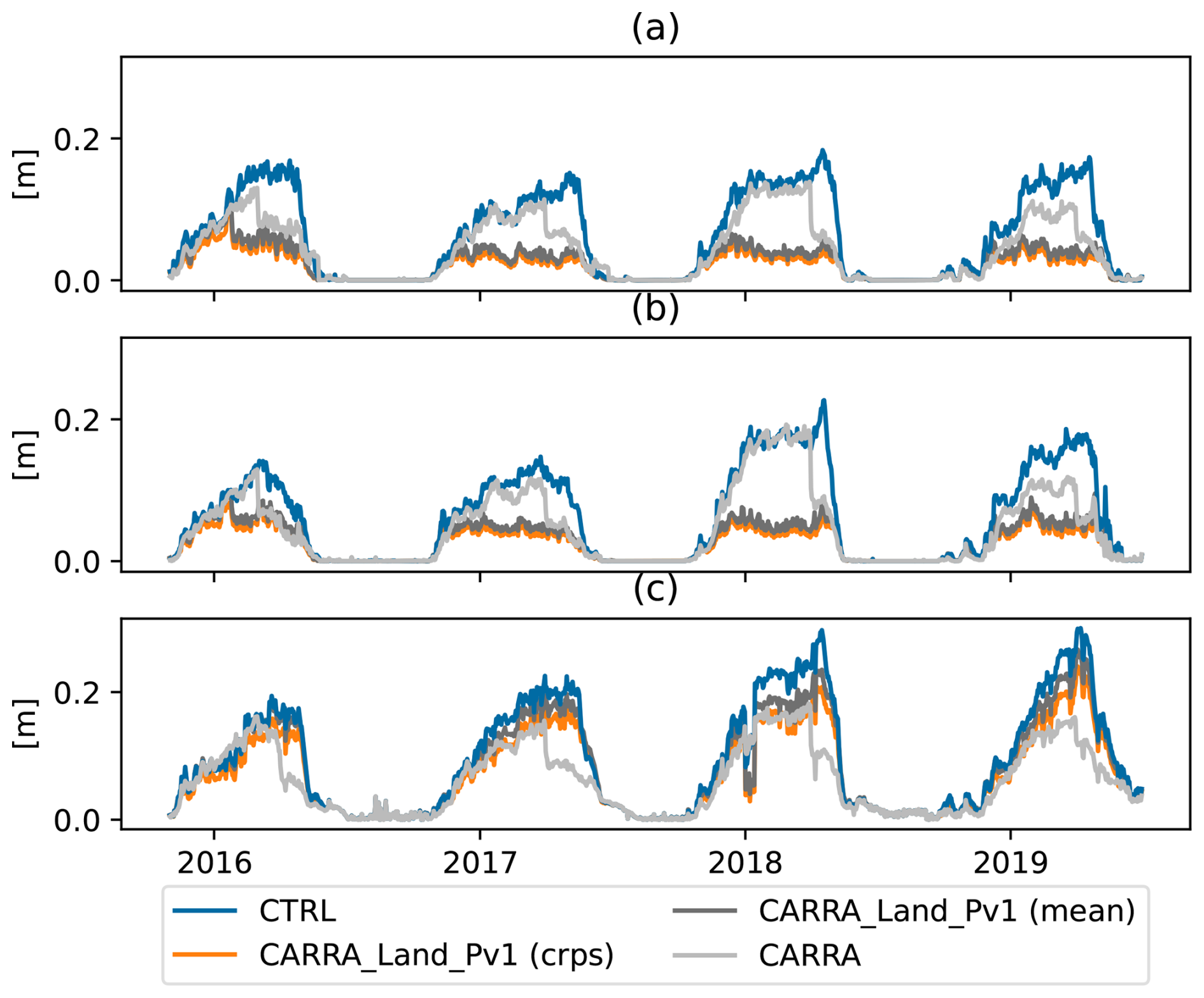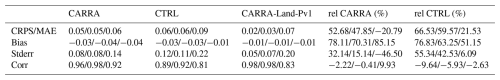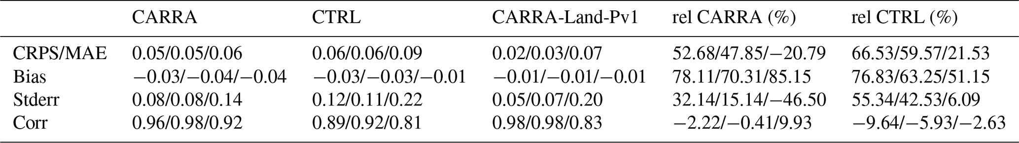 Figure 6 shows the evolution of domain average snow depth (Fig. 6a), snow water equivalent (Fig. 6b) and snow density (Fig. 6c) for the CARRA-Land-Pv1, CTRL and CARRA. In terms of snow water equivalent, CTRL and CARRA-Land-Pv1 have higher values at the yearly maximum compared to CARRA. In general, there are relatively small differences between CARRA-Land-Pv1 and CTRL. In CTRL and CARRA-Land-Pv1 the evolution of snow water equivalent is smoother compared to CARRA. CARRA tends to have lower snow depth than CARRA-Land-Pv1 and CTRL during the accumulation phase and higher during the melt phase. These characteristics are consistent for all years. The density evolves quite differently in the two snow models (CARRA vs CTRL and CARRA-Land-Pv1). In the single layer snow scheme used in CARRA, the maximum snow density is 300 kg m−3 while the explicit snow scheme (CTRL and CARRA-Land-Pv1) has an upper limit at 973 kg m−3. The snow density reach high values in the melting phase in the multi-layer snow scheme. In CARRA, snow density is increasing faster in the accumulation phase, and stabilises earlier in the winter. During the melting phase the snow density in CARRA decreases compared to the density in the multi-layer models. There is a discrepancy between the CARRA snow density and the climatological values used in its snow analysis. On average, this climatological density is less than the CARRA density before April and greater after May. This coincides with the snow depth differences described above. Comparing CARRA-Land-Pv1 and CTRL shows a slightly increased density in the assimilation experiment.