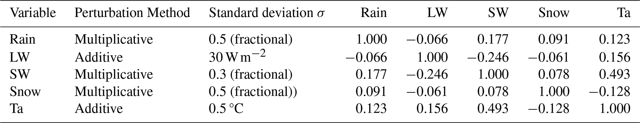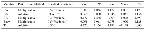 For ensemble based data assimilation methods, the ensemble perturbations X and Y are used to represent the uncertainty of the model estimate. They also describe the relationships between locations and between variables which map innovations to increments as shown above. It thus require care when generating the ensemble to ensure realistic relationship between the variables. The uncertainty can be sampled by perturbing forcing data, model state variables, model parameters or a combination of these (Slater and Clark2006; Lannoy et al.2010; Liu et al.2011; Kumar et al.2014, 2017; Blyverket et al.2019; Draper2021; Seo et al.2021; Brangers et al.2024). The benefit of only perturbing the forcing data is that the resulting model states are consistent with the model physics and the relationship between variables is as realistic as the model. However, processes that are unresolved by the model, for example redistribution by wind in our model, will not be represented by the ensemble by only perturbing the forcing data. Since we in this work introduce a multivariate control vector using the univariate observation vector, we only perturb the forcing data (rain, snow, longwave radiation, shortwave radiation, air temperature) to reduce the chance of introducing sampling noise. We follow the above studies and use cross-correlation between forcing variables to ensure realistic forcing conditions, temporal auto-correlation of the noise and spatially correlated noise (Reichle and Koster2003; Durand and Margulis2007; Lannoy et al.2010). The details about the perturbation parameters are found in Table 1. The cross-correlations shown in Table 1 are computed from one year of forcing data. Spatial and temporal correlation lengths are provided in Table 2.