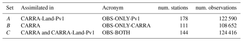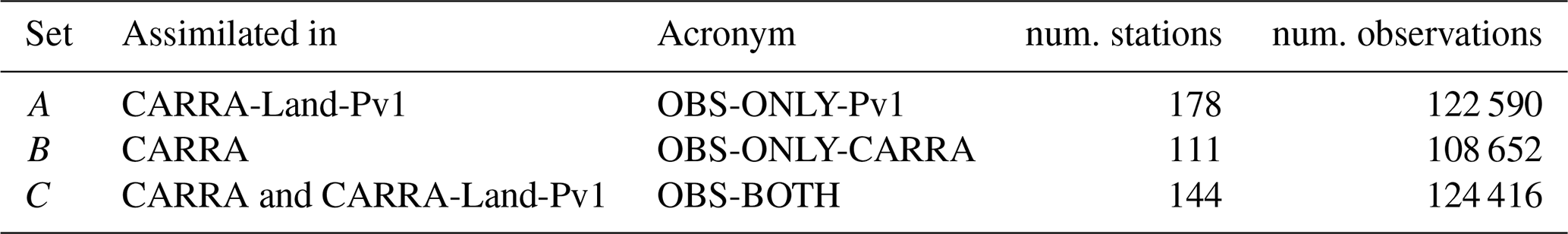 In situ snow depth observations used in the data assimilation are obtained from the Meteorological Archival and Retrieval System (MARS) of the European Centre for Medium-Range Weather Forecasts (ECMWF). The observation dataset is not identical to the one used in CARRA, as CARRA uses additional local observations and a different quality control. Thus, we can bin observations into three sets. Let A^ be the observations used in CARRA-Land-Pv1 and B^ the observations used in CARRA. Further let C=A^B^ be the observations used in both systems, A=A^-B^ the stations only used in CARRA-Land-Pv1 and B=B^-A^ the stations only used in CARRA. In the following we will denote dataset A as “OBS-ONLY-Pv1”, B as “OBS-ONLY-CARRA” and C as “OBS-BOTH”. In addition, snow water equivalent from 6 snow pillow stations (Tollan1970; Egli et al.2009) are used to evaluate the unobserved (by the assimilation system) snow water equivalent state. In CARRA, satellite derived snow cover maps are converted to in situ pseudo observations and assimilated in a similar way as real in situ snow depth. We considered to assimilate satellite snow cover in this study, but chose to focus on point observations. We suggest that satellite snow cover products are included in a follow up study.