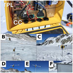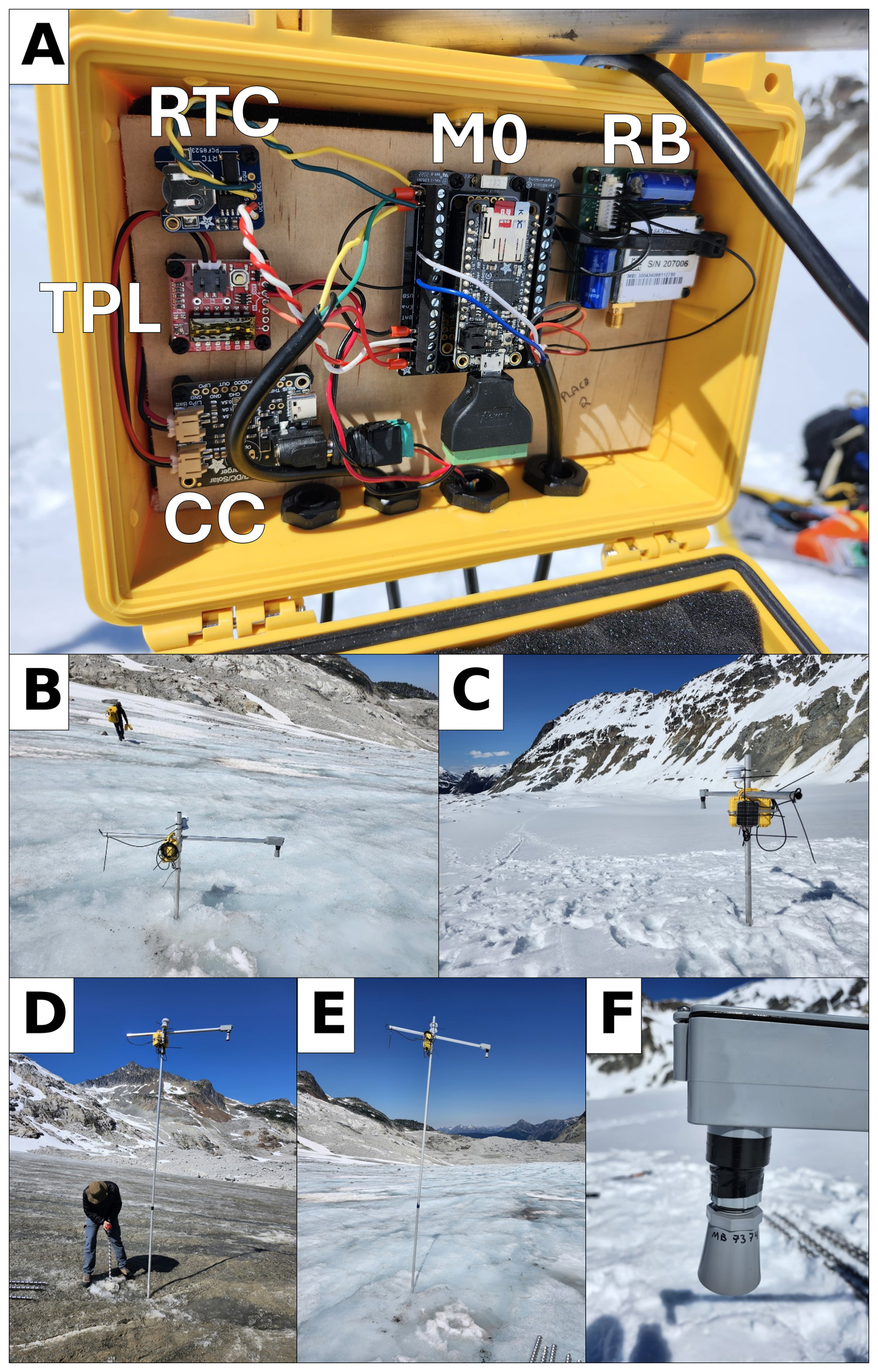 Figure 2Photographs of the smart stakes on Place Glacier. (A) Place 2 station wiring with M0 (Feather M0), RB (RockBlock 9603), RTC (Real-time Clock), TPL (TPL5110 Nano Power Timer), CC (Charge Controller), and battery (behind the wooden board); (B) Place 2 on 16 July 2024; (C) Place 2 on 9 May 2024; (D) Place 1 on 16 July 2024; (E) Place 2 on 16 July 2024; (F) MaxBotix Ultrasonic Sensor (MB7374 HRXL-MaxSonar-WRST7).