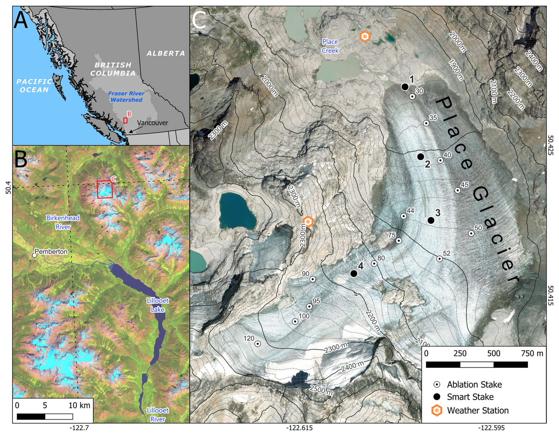 Figure 1(A) Map of British Columbia highlighting the Fraser River watershed with the extent of panel (B) shown as a red square; (B) Location of Place Glacier in relation to Pemberton and Lillooet Lake with a false-color shortwave infrared 2024 seasonal mosaic from Sentinel-2 satellite imagery as a basemap; (C) Location of ablation stakes, smart stakes, and weather stations on Place Glacier with an 2 August 2024 orthoimage from aerial photography and lidar derived contour lines.