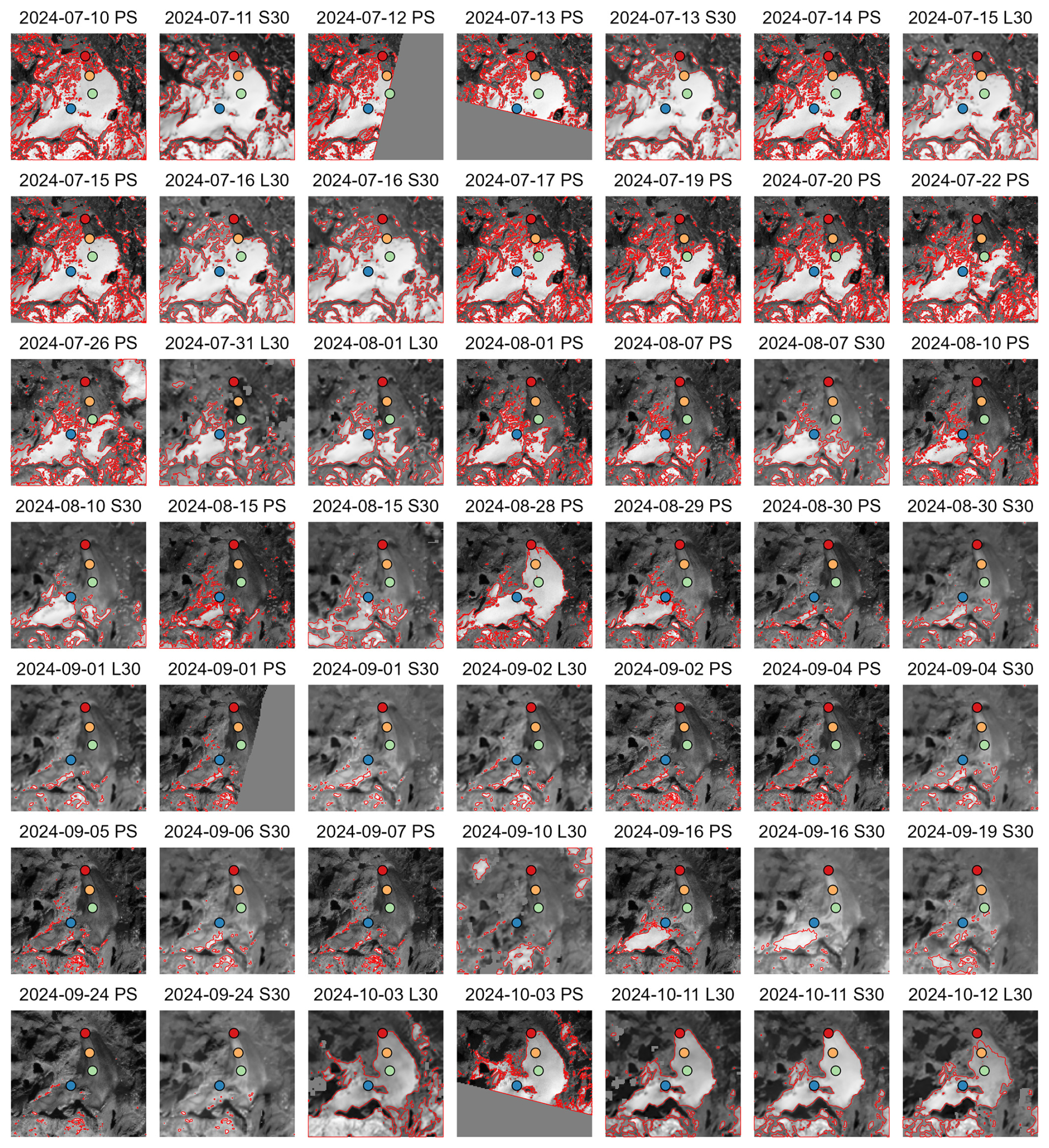 Figure 4Selected Landsat 8/9 (L30), Sentinel-2 (S30), and PlanetScope Dove (PS) near infrared images of Place Glacier. The red outline is the snow mask determined from a 0.4 threshold of the near infrared band, and the points are the smart stake locations (Sites 1–4 are colored red, orange, green, and blue, respectively).