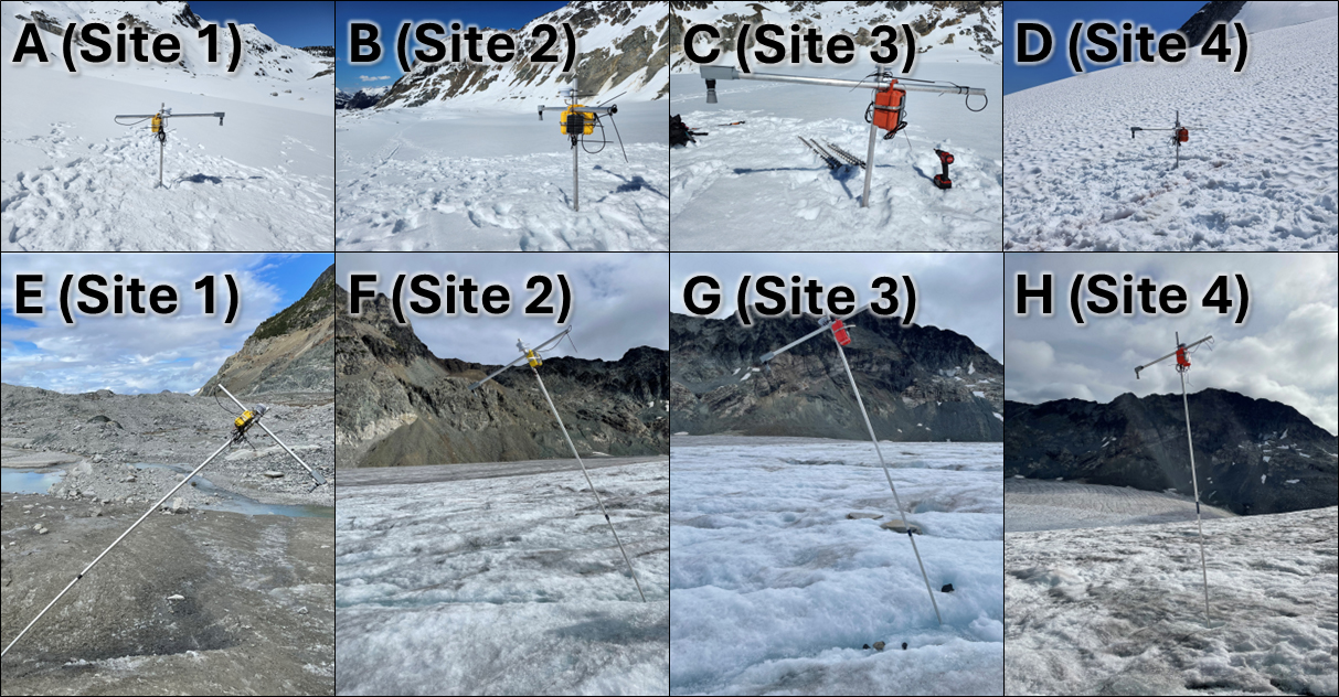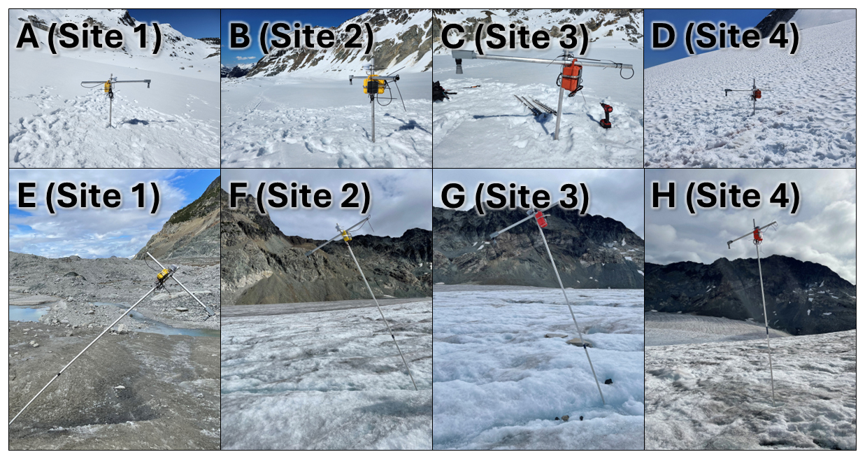 The four smart stakes installed at the end of the accumulation season (8 and 9 May 2024) cover an elevation range from 1842 to 2156 m a.s.l. (Fig. 1, Table 2). We accessed the glacier by helicopter, which adds financial considerations to the frequency of field visits and the cost benefit of real-time data. The uppermost region of the accumulation area was not instrumented due to field safety and logistical constraints during the May 2024 fieldwork, namely poor visibility at higher elevations caused by low cloud. To prevent the stakes from melting out and tipping over, we redrilled the stakes on 16 July 2024, and again on 21 September 2024. Smart stake data from 8 May to 14 November 2024, are used in this study. Site 1 is located near the glacier terminus, where the north facing glacier's slope is 10°. Site 2 is 535 m away on a gentler 9° slope with the same north aspect. Site 3 is on a flatter 5° northward flowing bench, right before the glacier turns westward up glacier. Site 4 is on a steep 16° east-northeast ramp that leads to a high elevation bowl (Fig. 1, Table 2).