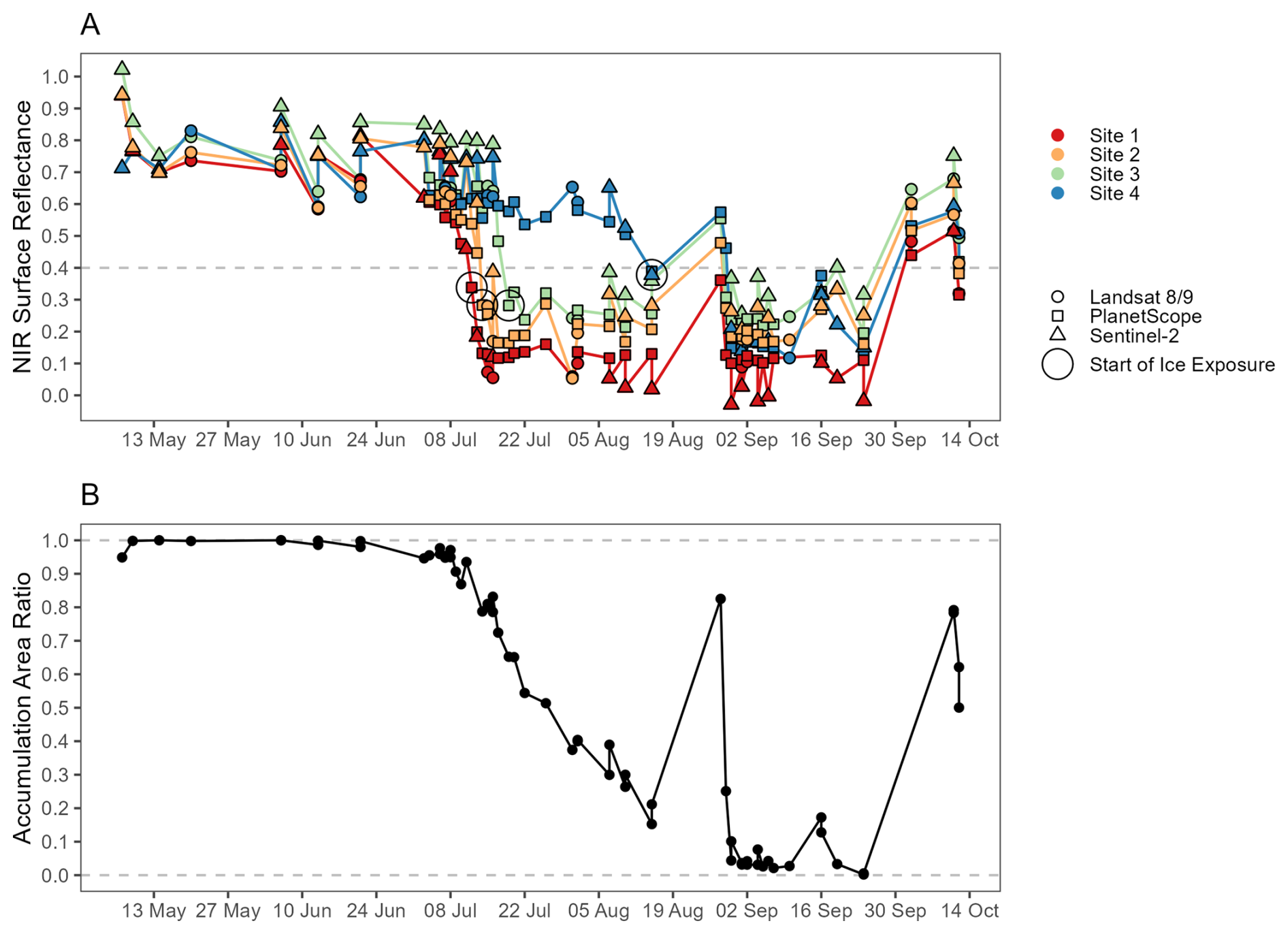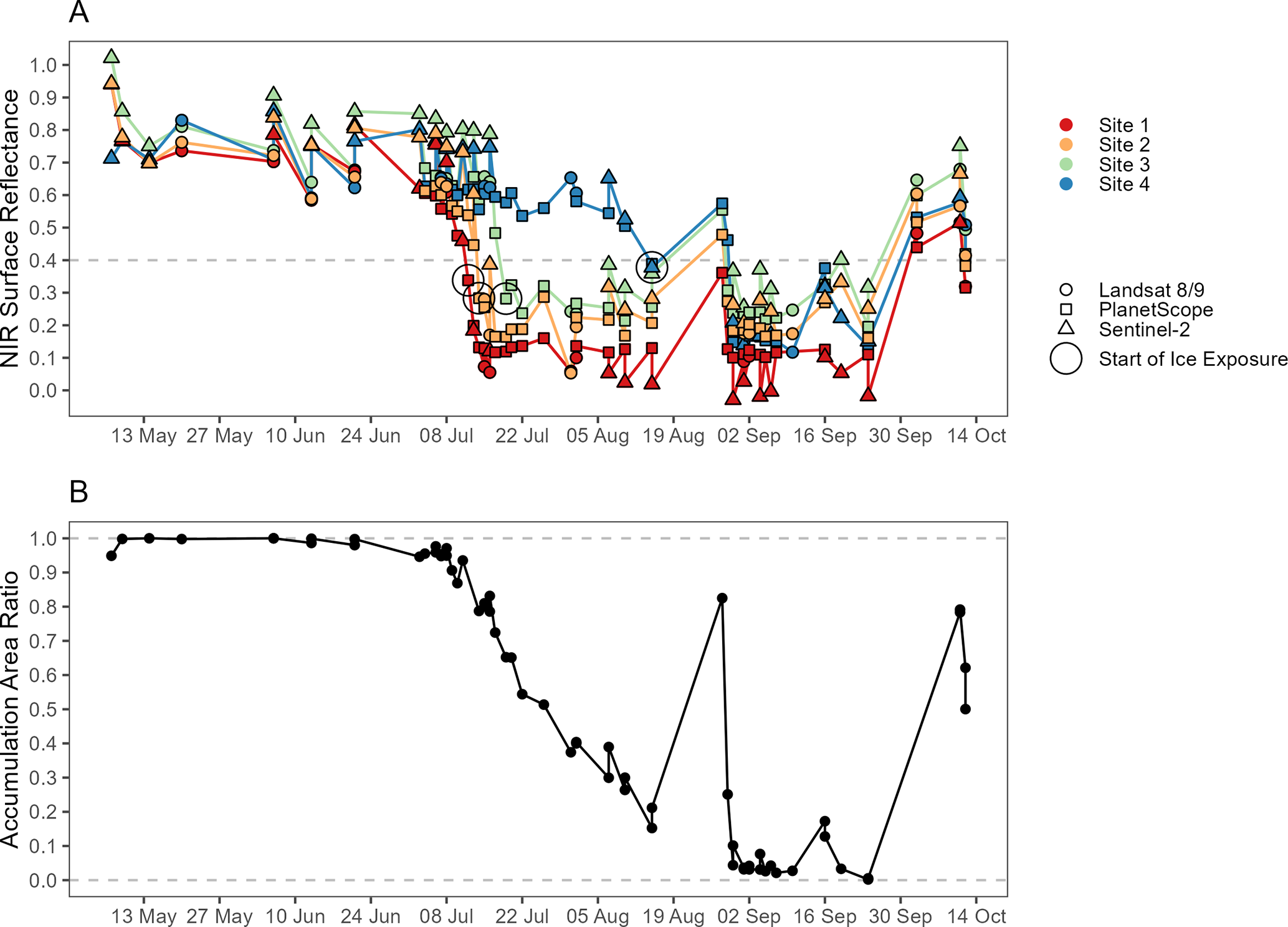 The HLS dataset combines imagery from the Operational Land Imager (OLI) aboard Landsat 8 and Landsat 9 satellites with the Multi Spectral Instrument (MSI) aboard the three Sentinel-2 satellites (2A, 2B and 2C). The HLS has an average revisit time of 2–3 d at 30 m resolution. The imagery was accessed programmatically from Microsoft Planetary Computer (Microsoft Open Source et al., 2022) using the “rstac” package (Simoes et al., 2021). Between 1 May –31 October 2025, there were 34 images available from Landsat and 57 from Sentinel-2. PS is a constellation of commercial CubeSat satellites that offer near-daily 3.8 m resolution optical imagery and have been used in other glaciological studies (Liu et al., 2024; Tarca et al., 2023). The “planetR” package was used to bulk download 73 scenes that intersect the bounding box of the area of interest with less than 20 % cloud cover (Bevington, 2023). We manually filtered out partial or cloudy images, leaving 15 Landsat, 25 Sentinel-2, and 31 PlanetScope Dove images, for a total of 71 images. These images represent 47 unique dates due to acquisitions on the same day by different sensors.