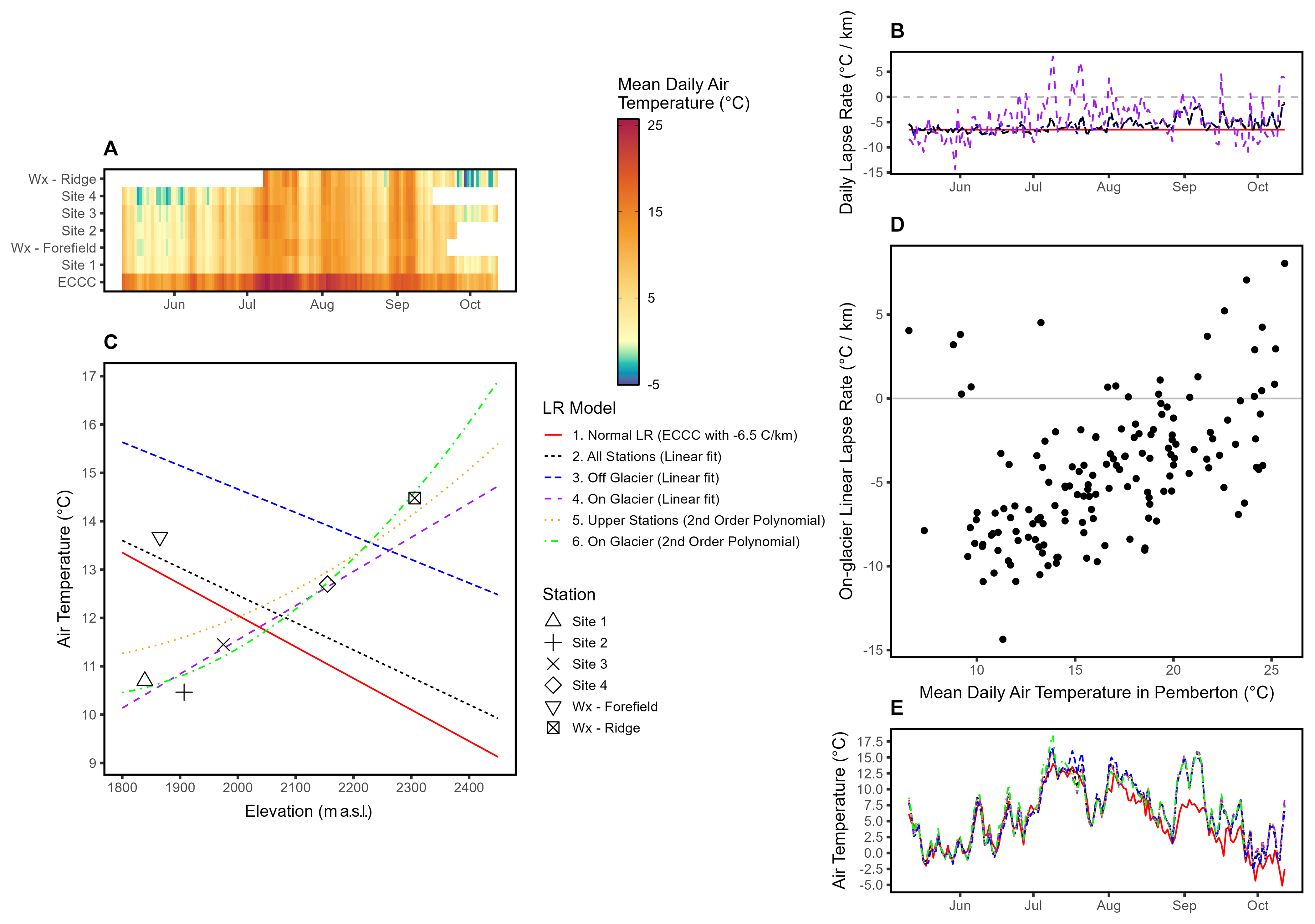 Previous work demonstrated the importance of understanding on- and off-glacier air temperatures, and the important local influence of the ice temperature and air flow dynamics within the katabatic boundary layer (Ayala et al., 2015; Shea et al., 2009; Shea and Moore, 2010). Our air temperature models do not explicitly account for effects occurring inside or outside the katabatic boundary layer, as we lack the required data to do so. The effects of the katabatic boundary layer may, however, be partially accounted for by using on-glacier stations in lapse rate calculations.