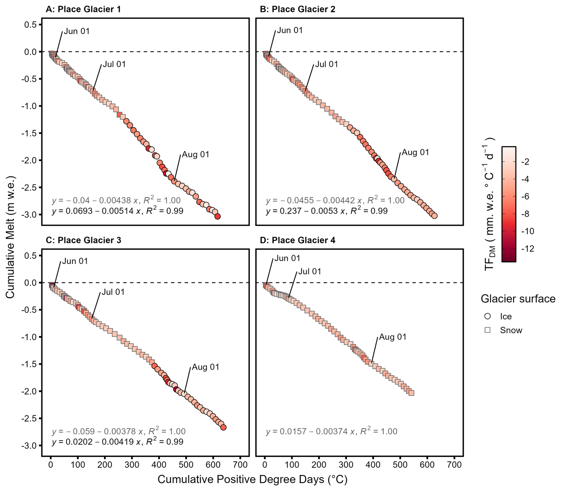 Shea, J., Dan Moore, R., and Stahl, K.: Derivation of melt factors from glacier mass-balance records in western Canada, J. Glaciol., 55, 123–130, https://doi.org/10.3189/002214309788608886, 2009.