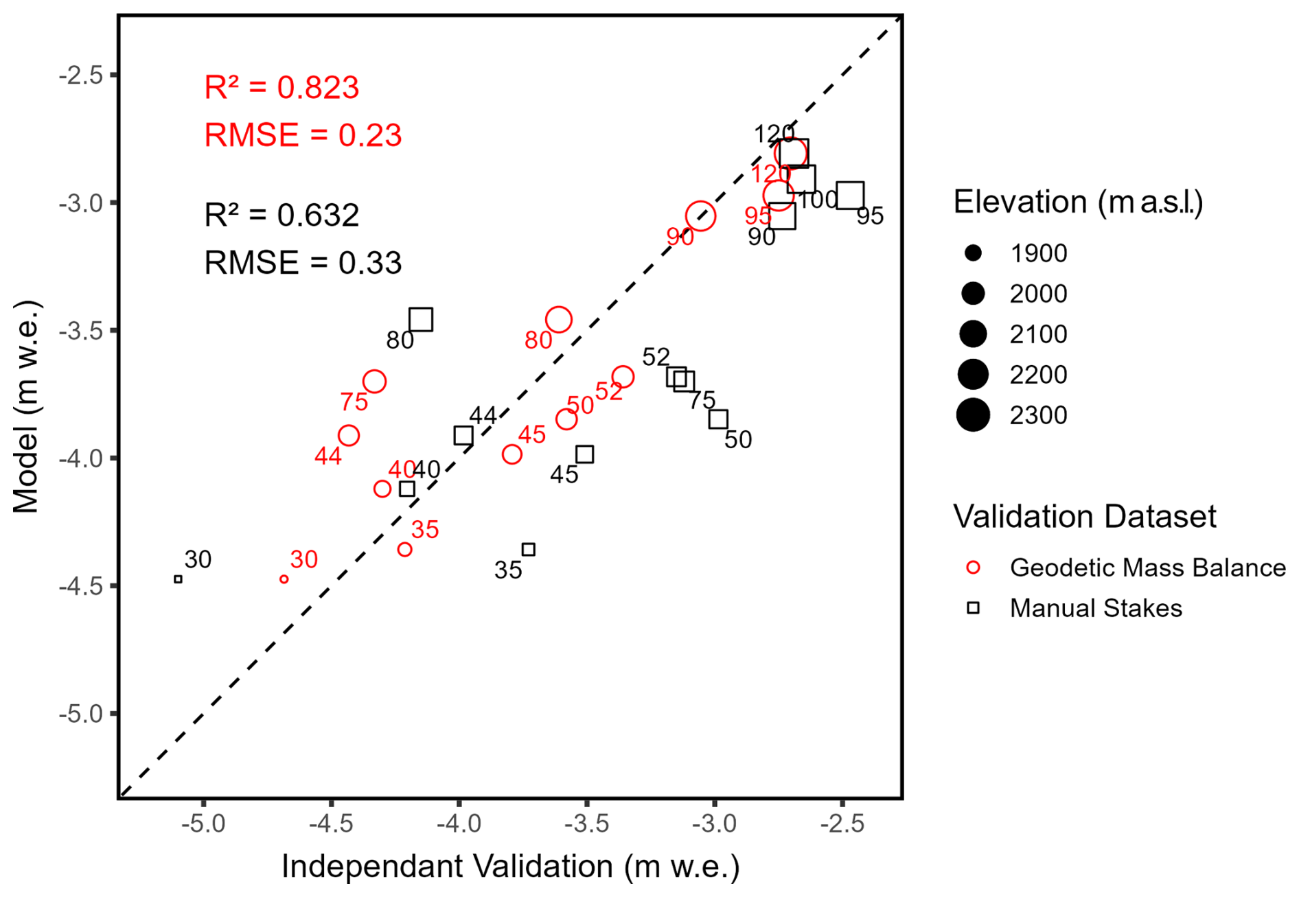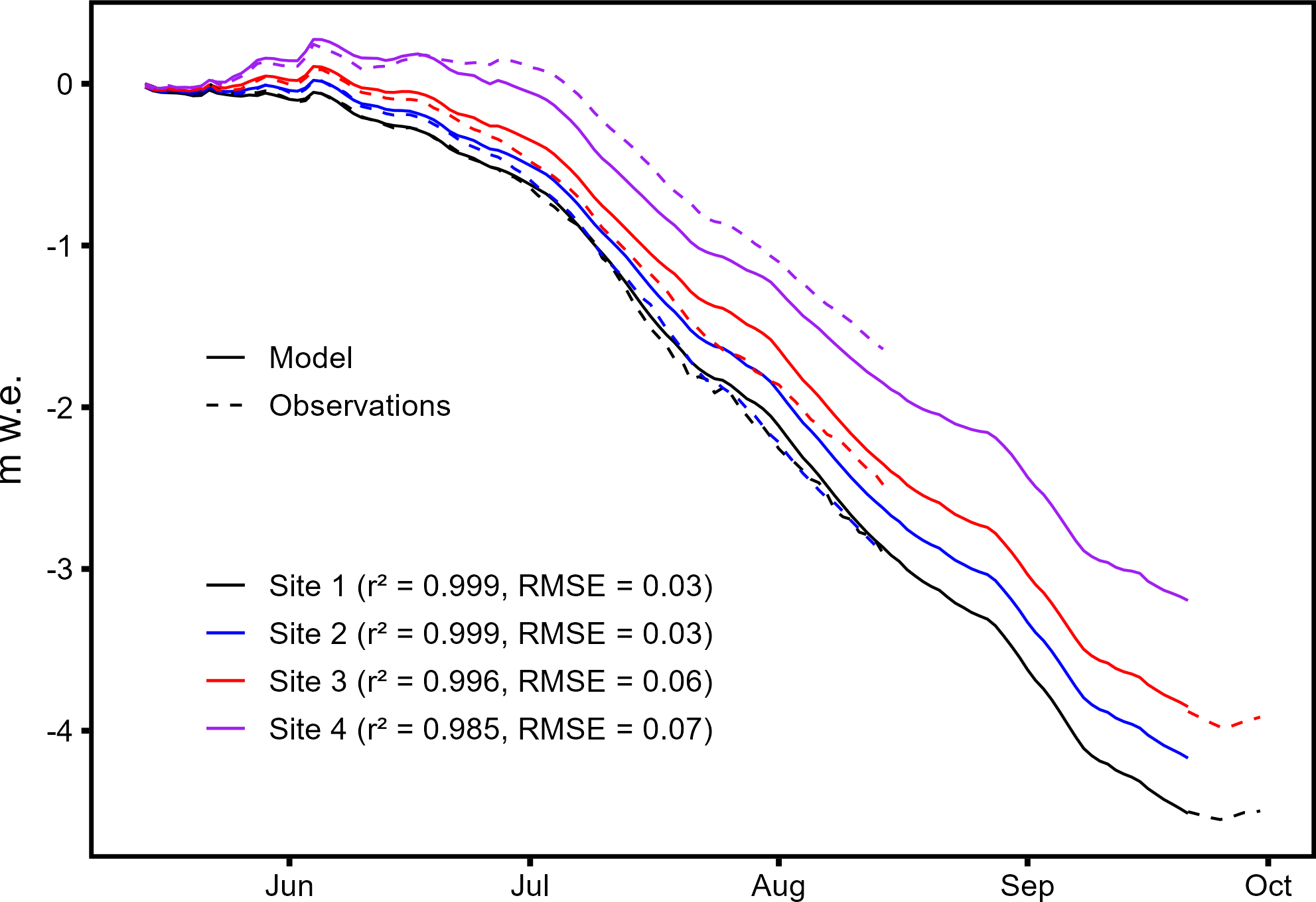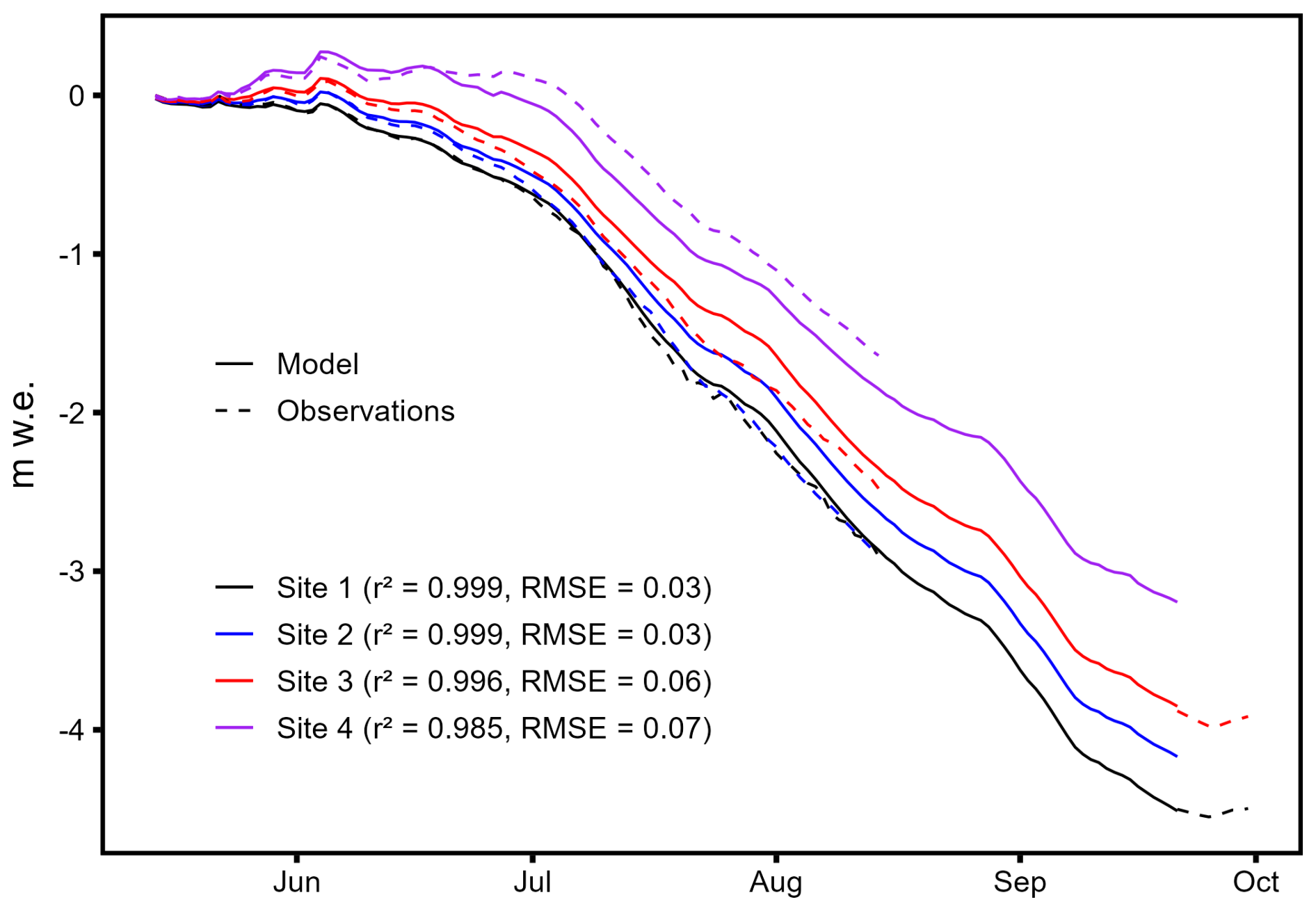 In this paper, we combine in-situ and geospatial data to assess the utility of smart stakes by building a distributed glacier melt model using the smart stake data and testing the model against two independent validation datasets (Fig. 3).