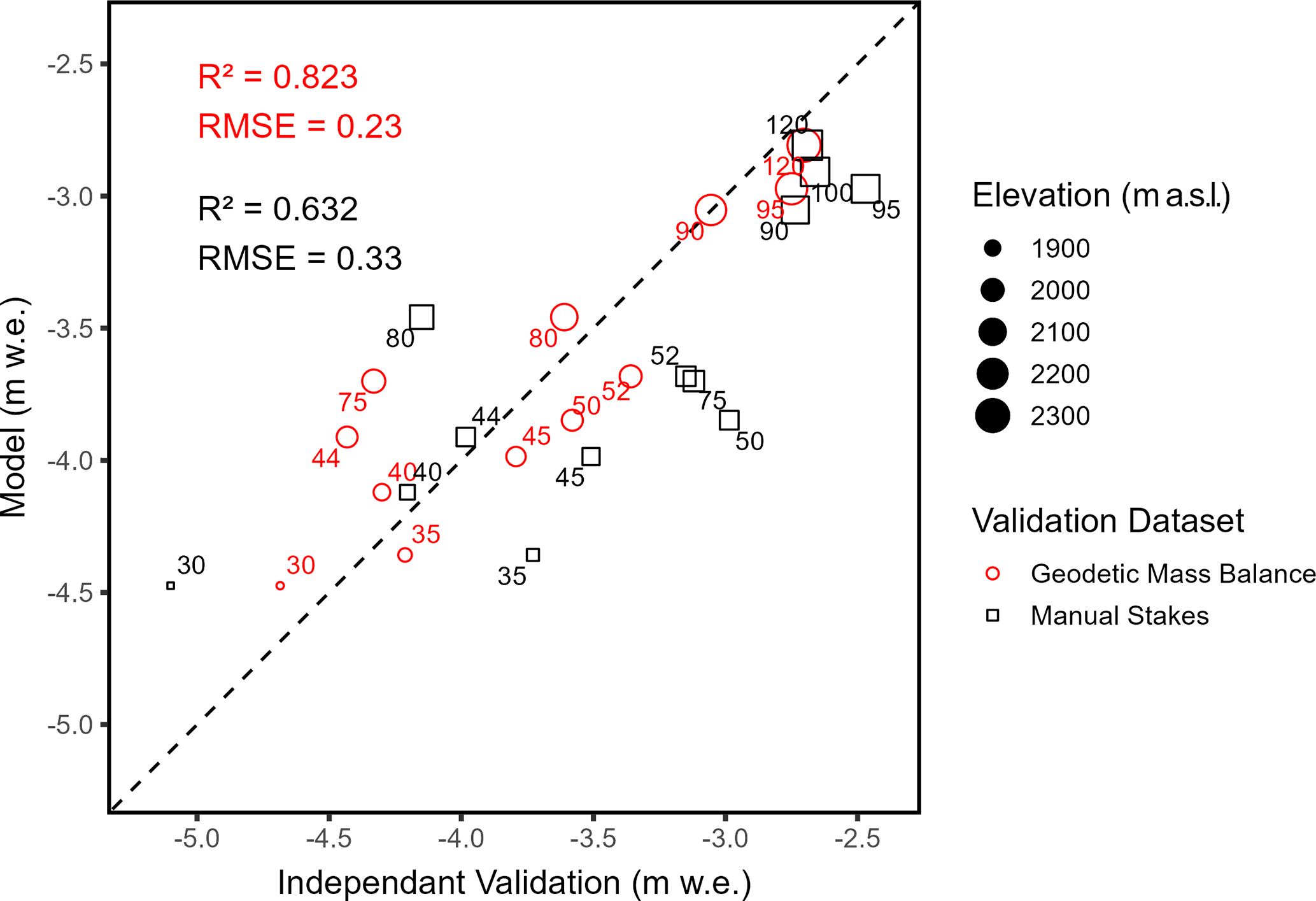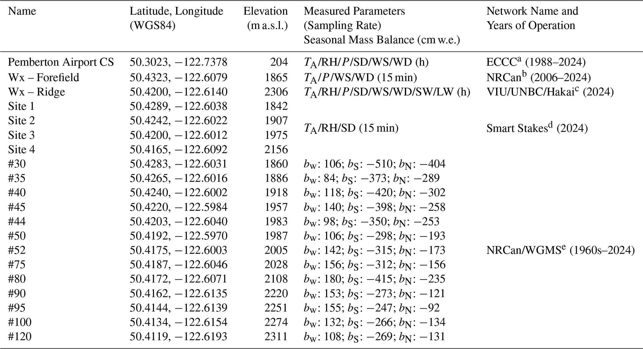 Data from thirteen manual ablation stakes collected by NRCan as part of the WGMS are used as validation data in this study (Fig. 1, Table 2). The stake positions and degree of melt are surveyed in autumn every year and snow depth and density are measured in the spring (WGMS, 2024). We only use the manual ablation stake field data for years 2023–2024. Field data collection occurred on 7 October 2023, 19–20 April 2024, and 20–21 September 2024. Snow densities on 19–20 April 2024, ranged from 419 to 472 kg m−3, with an average of 434 kg m−3. The highest recorded densities were located at lower elevations on the glacier. The winter, summer, and net mass balance for each manual stake are reported in Table 2. This data is used as an independent validation dataset for melt modelling (Fig. 3).