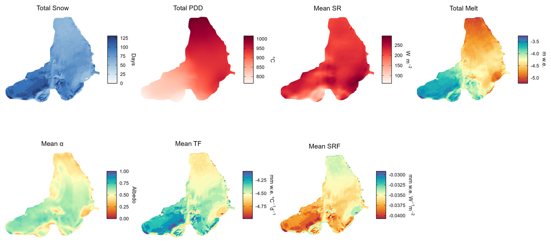 The melt models are then applied to every pixel which is converted to a total seasonal melt volume (m3) by multiplying the estimated melt (m w.e.) by the pixel resolution (in m) and adding together the daily totals. The summer balance can then be calculated as the melt volume divided by the glacier area.