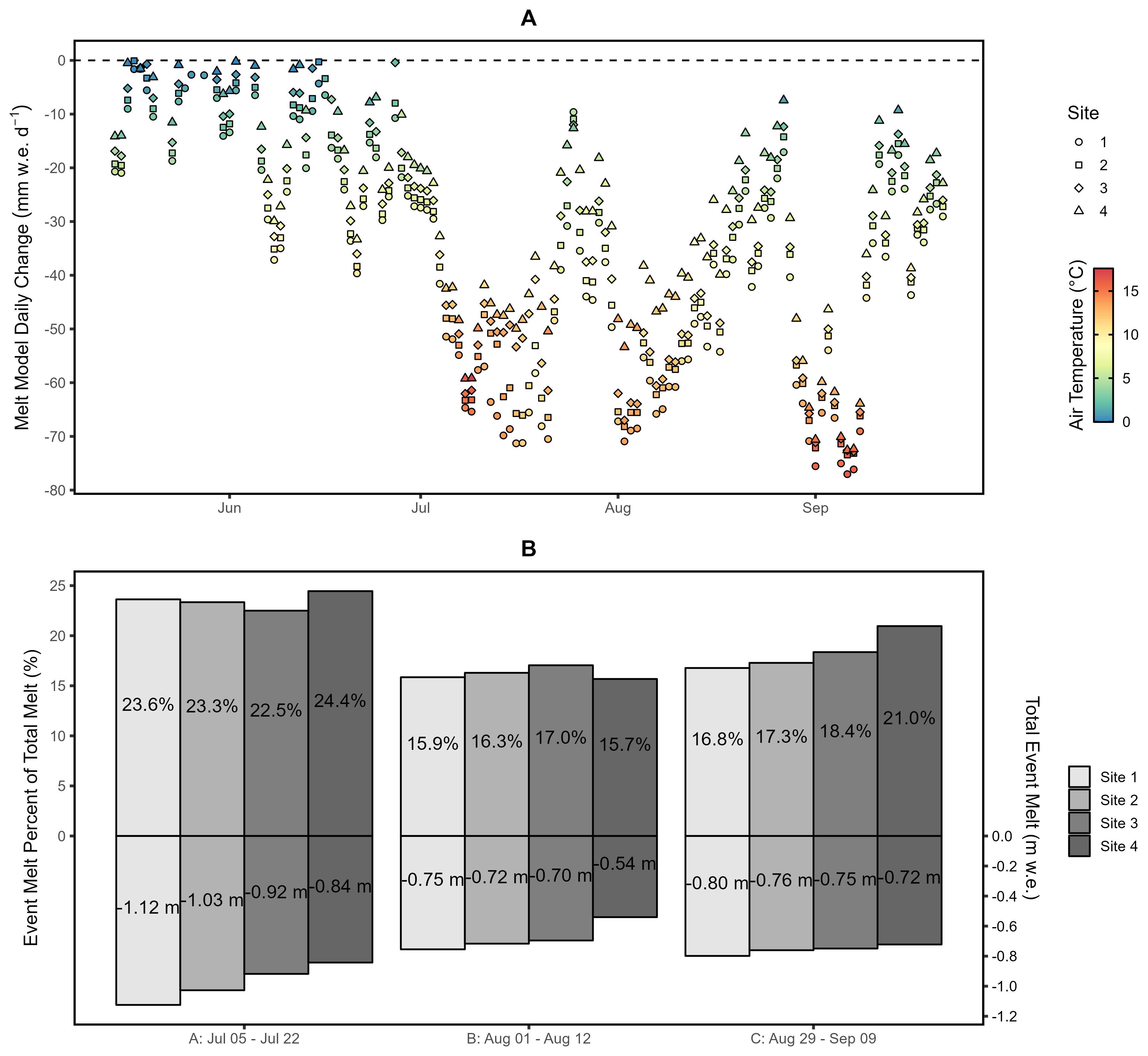 Glacier mass balance is a key metric used to quantify the impact of regional and global climate change (IPCC, 2023). With a warming climate and increases in summer heat waves, the process of ablation – which includes melting and sublimation of snow and ice – is fundamental in determining a glacier's overall health (Cremona et al., 2023; Østrem, 1973; Pelto, 2019; Reyes and Kramer, 2023). Ablation is commonly measured by surveying physical stakes that are drilled into the surface of a glacier (Cogley et al., 2011). While these in-situ measurements are critical to improve mass balance models and understand long-term mass balance trends, glaciers with in-situ records are rare and those records are typically only available at monthly or seasonal time scales (Hugonnet et al., 2021; Moore and Demuth, 2001; Pelto, 2019).
