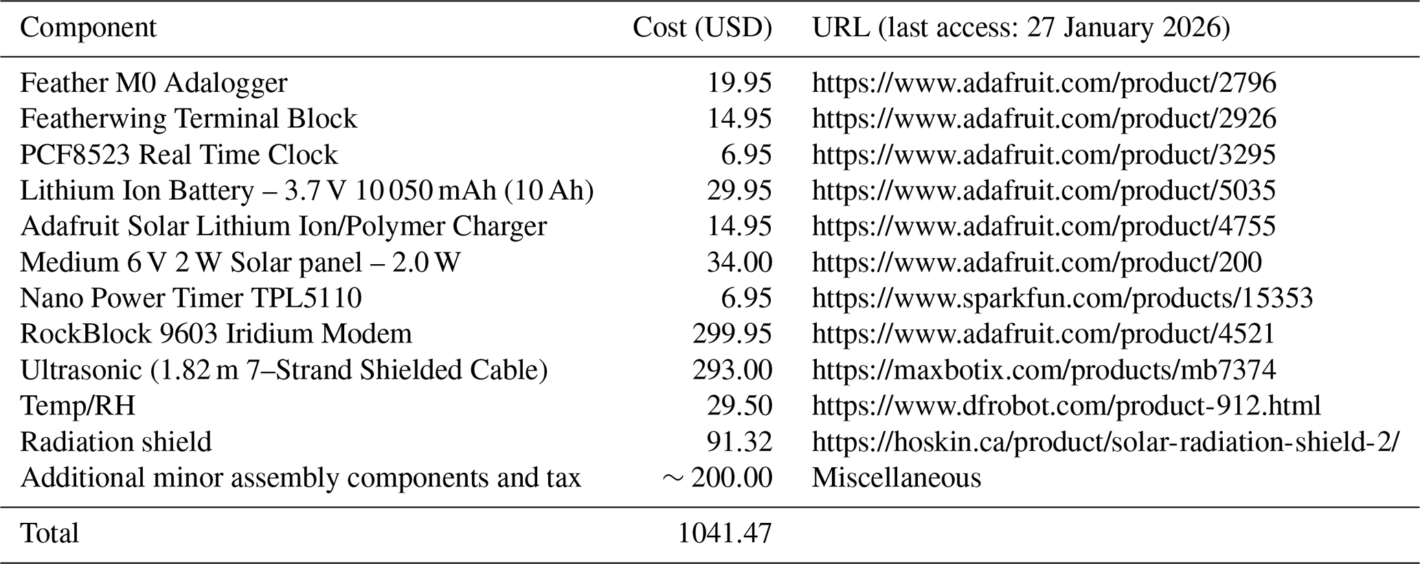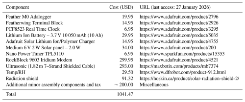 Table 1Primary components of the smart stakes with prices in USD from 6 June 2025. This list does not include a detailed breakdown of the minor components nor the ablation pole hardware.