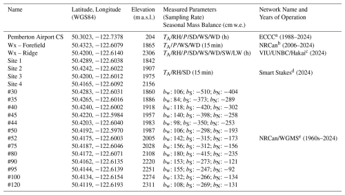 Table 2Metadata for the three weather stations, four smart stakes, and 13 WGMS stakes, see Fig. 1 for site locations.