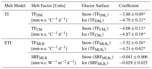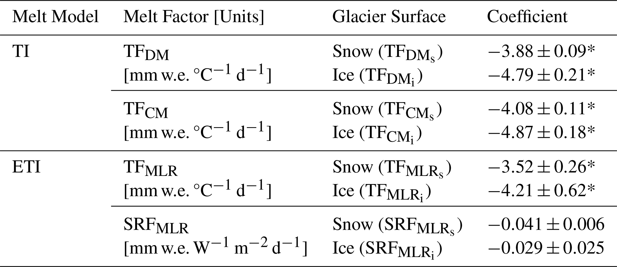 We calculate TF and SRF in three different ways: (1) TF is calculated from daily PDD and daily melt values (TFDM); (2) TF is calculated from cumulative PDD and cumulative melt (TFCM); and (3) TF and SFR are calculated from solving a multiple linear regression from the daily values (TFMLRand SRFMLR). The two first methods are used in the TI model, Eq. (1), and the third method is used in the ETI model, Eq. (2). Melt factors are often similar among stakes, and are often assumed to be constant over time, however in reality they have been shown to change day-to-day, highlighting then need for energy balance models.