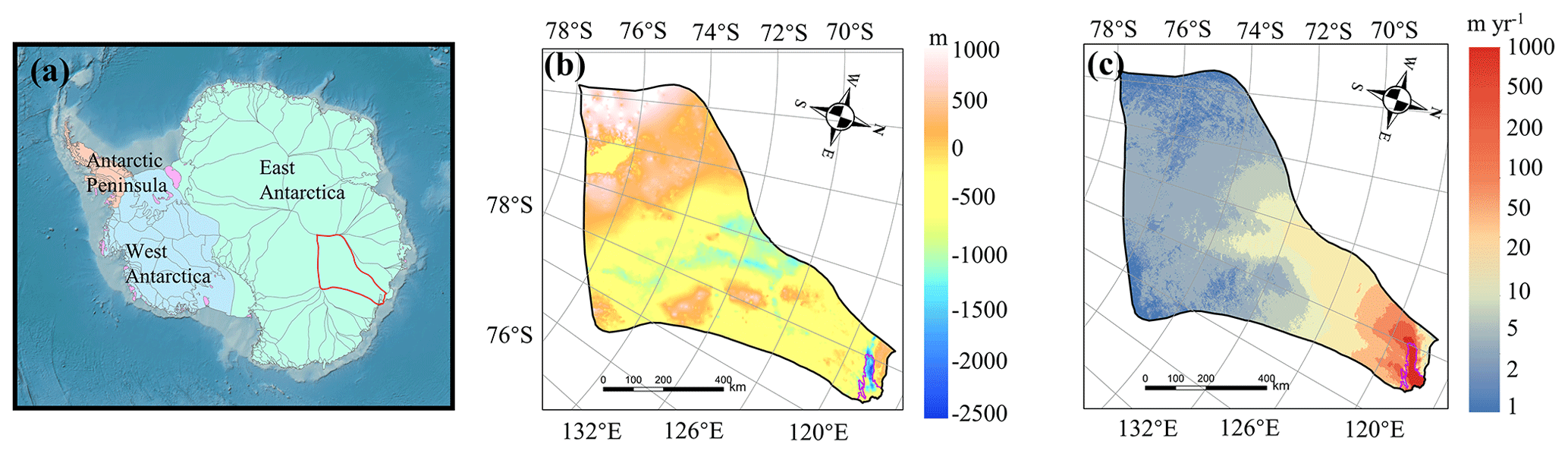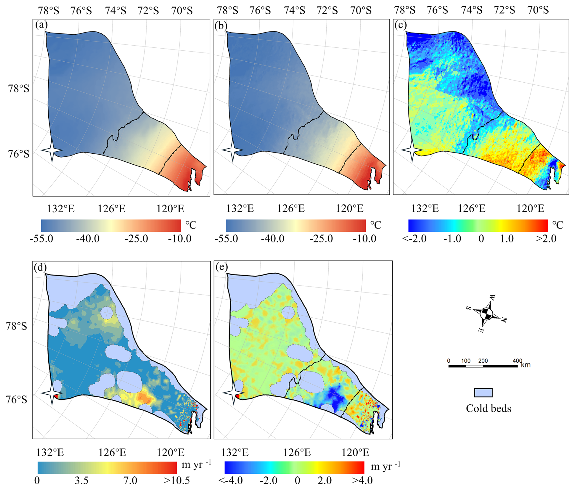MEaSUREs BedMachine Antarctica, version 2, is available at https://doi.org/10.5067/E1QL9HFQ7A8M (Morlighem, 2020). MEaSUREs InSAR-Based Antarctic Ice Velocity Map, version 2, is available at https://doi.org/10.5067/D7GK8F5J8M8R (Rignot et al., 2017). MEaSUREs Antarctic Boundaries for IPY 2007–2009 from Satellite Radar, version 2, is available at https://doi.org/10.5067/AXE4121732AD (Mouginot et al., 2017). ALBMAP v1 and the GHF dataset of Shapiro and Ritzwoller (2004) are available at https://doi.org/10.1594/PANGAEA.734145 (Le Brocq et al., 2010b). MODIS-based near-surface air temperature data are available at https://doi.org/10.11888/Atmos.tpdc.272234 (Zhang, 2022). The GHF dataset of An et al. (2015) is available at http://www.seismolab.org/model/antarctica/lithosphere/AN1-HF.tar.gz (last access: 4 January 2026). The GHF dataset of Shen et al. (2020) is available at https://sites.google.com/view/weisen/research-products?authuser=0 (last access: 4 January 2026). The GHF dataset of Martos (2017) is available at https://doi.org/10.1594/PANGAEA.882503. The GHF dataset of Purucker (2012) is available at https://core2.gsfc.nasa.gov/research/purucker/heatflux_mf7_foxmaule05.txt (last access: 11 April 2023). The modelled basal temperature and basal melt rate from Huang et al. (2024) are available at https://doi.org/10.5281/zenodo.7825456 (Zhao et al., 2023).