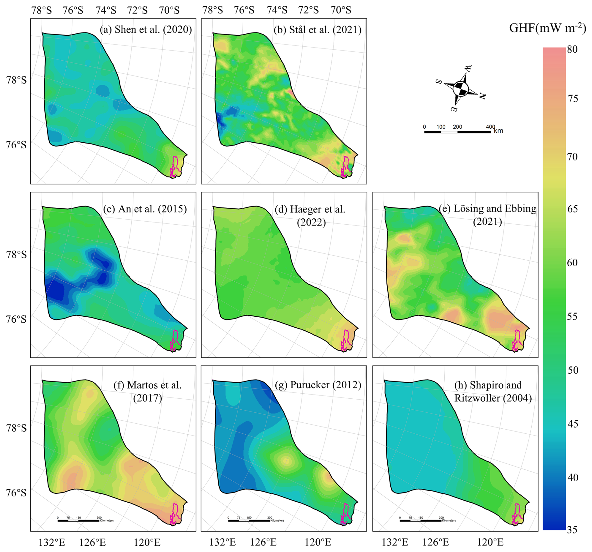 Kang, H., Zhao, L., Wolovick, M., and Moore, J. C.: Evaluation of six geothermal heat flux maps for the Antarctic Lambert–Amery glacial system, The Cryosphere, 16, 3619–3633, https://doi.org/10.5194/tc-16-3619-2022, 2022.