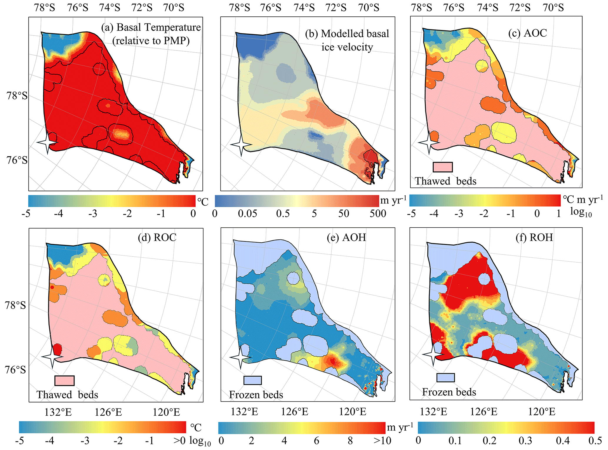 Figure 3Spatial distribution of modelled basal ice temperature (a), modelled basal ice velocity magnitude (b), AOC (c), ROC (d) inconsistencies in modelled frozen-bedded regions, and AOH (e) and ROH (f) inconsistencies in modelled thawed-bedded regions associated with Martos et al. (2017) GHF. The colormap in (c) and (d) is on logarithmic scale. The pink region in (c) and (d) represents modelled thawed bed, while the blue region in (e) and (f) indicates frozen-bedded areas. The white star represents Dome C.