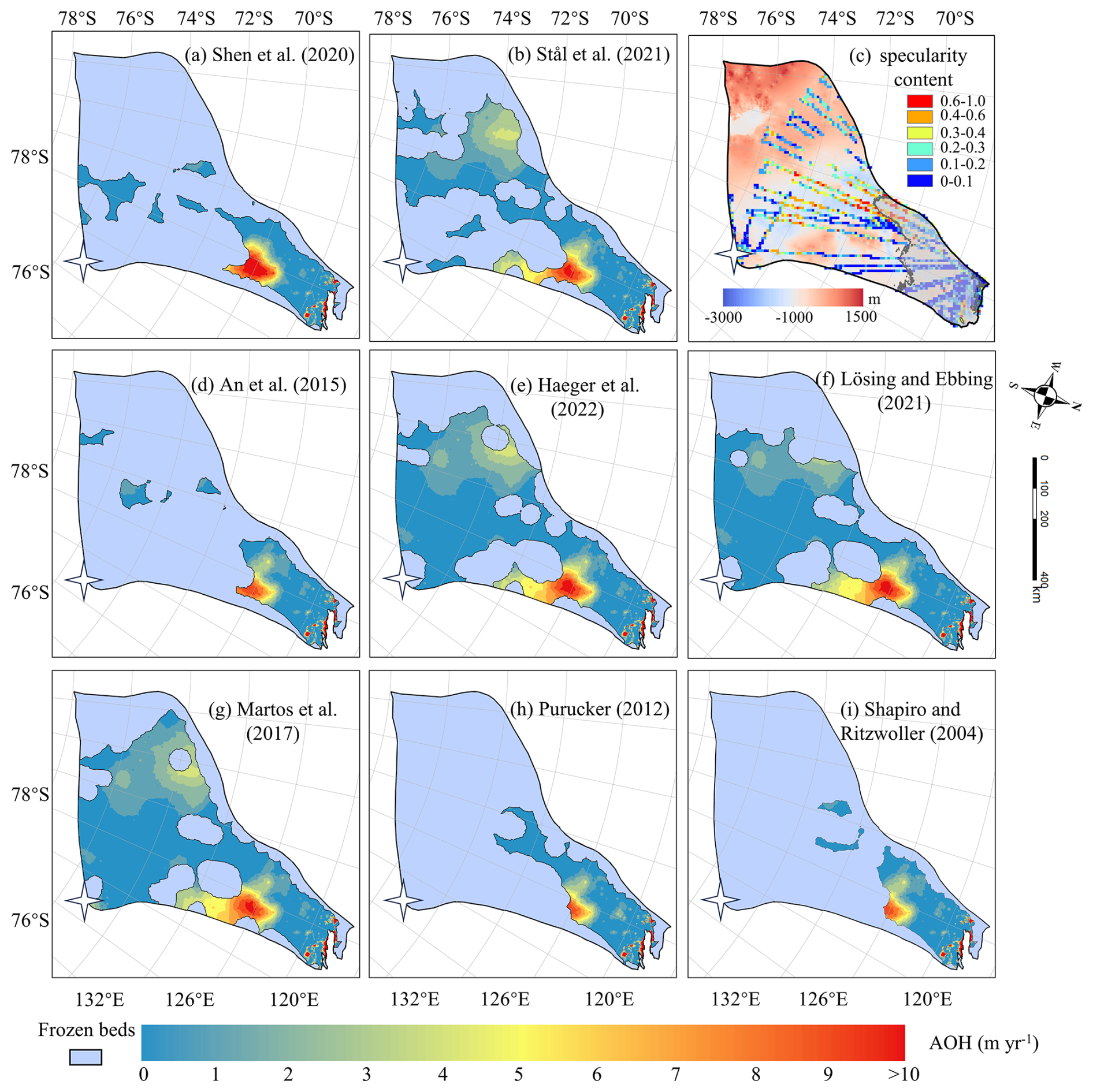 Figure 6Spatial distribution of AOH in thawed-bedded regions with (a)–(b) and (d)–(i) corresponding to the GHFs (a–h) in Fig. 2. The blue region indicates frozen-bedded areas. (c) Locations of specularity content, same as Fig. 4c. The white star represents Dome C.