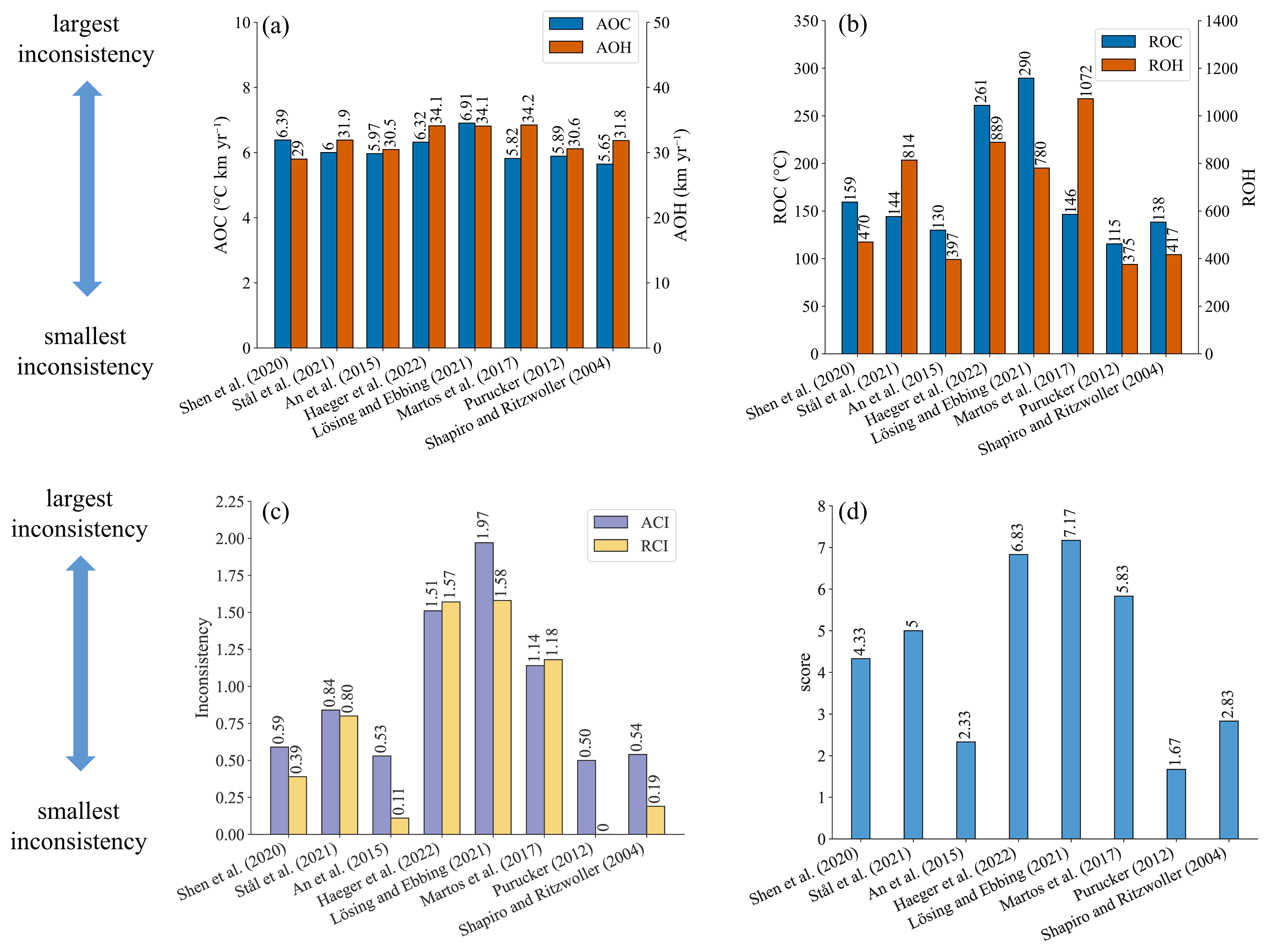Figure 8Six inconsistency indicators and the final ranking of eight GHF datasets. (a) The absolute overcooling and overheating inconsistencies, AOC and AOH; (b) the relative overcooling and overheating inconsistencies, ROC and ROH; (c) the absolute and relative combined inconsistencies, ACI and RCI; (d) the average of ranking scores from one to eight using the six inconsistency indicators. The values of inconsistencies and scores are labeled at the top of the bars.