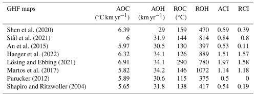 To assess the overall inconsistency of each geothermal heat flux dataset, we calculate the sum of each metric over all points. All inconsistency indices for the simulation results using the eight GHF datasets are illustrated in Fig. 8. The overheating inconsistency associated with Purucker (2012) and Shapiro and Ritzwoller (2004) GHFs is predominantly localized in fast-flowing regions. Consequently, after normalization by the observed surface velocity magnitude, their relative rankings improve (Fig. 8). The GHFs from Purucker (2012), An et al. (2015), Shapiro and Ritzwoller (2004), and Shen et al. (2020) demonstrate balanced performance with respect to both overheating and overcooling inconsistency metrics, thereby securing the top four positions in both ACI and RCI. Their ACI values exhibit similarity, ranging from 0.50 to 0.59 (Fig. 8c). In contrast, simulation result utilizing Martos et al. (2017) GHF exhibits low AOC but high AOH. Simulation results utilizing Stål et al. (2021) GHF show low ROC but relatively high ROH. Notably, simulation results employing GHFs from Martos et al. (2017), Haeger et al. (2022), and Lösing and Ebbing (2021) demonstrate comparably high AOH values. These four GHF datasets – Martos et al. (2017), Stål et al. (2021), Haeger et al. (2022), and Lösing and Ebbing (2021) – are ranked in the bottom four positions for both ACI and RCI metrics. Furthermore, the ranking order of the eight GHFs remains consistent between ACI and RCI.