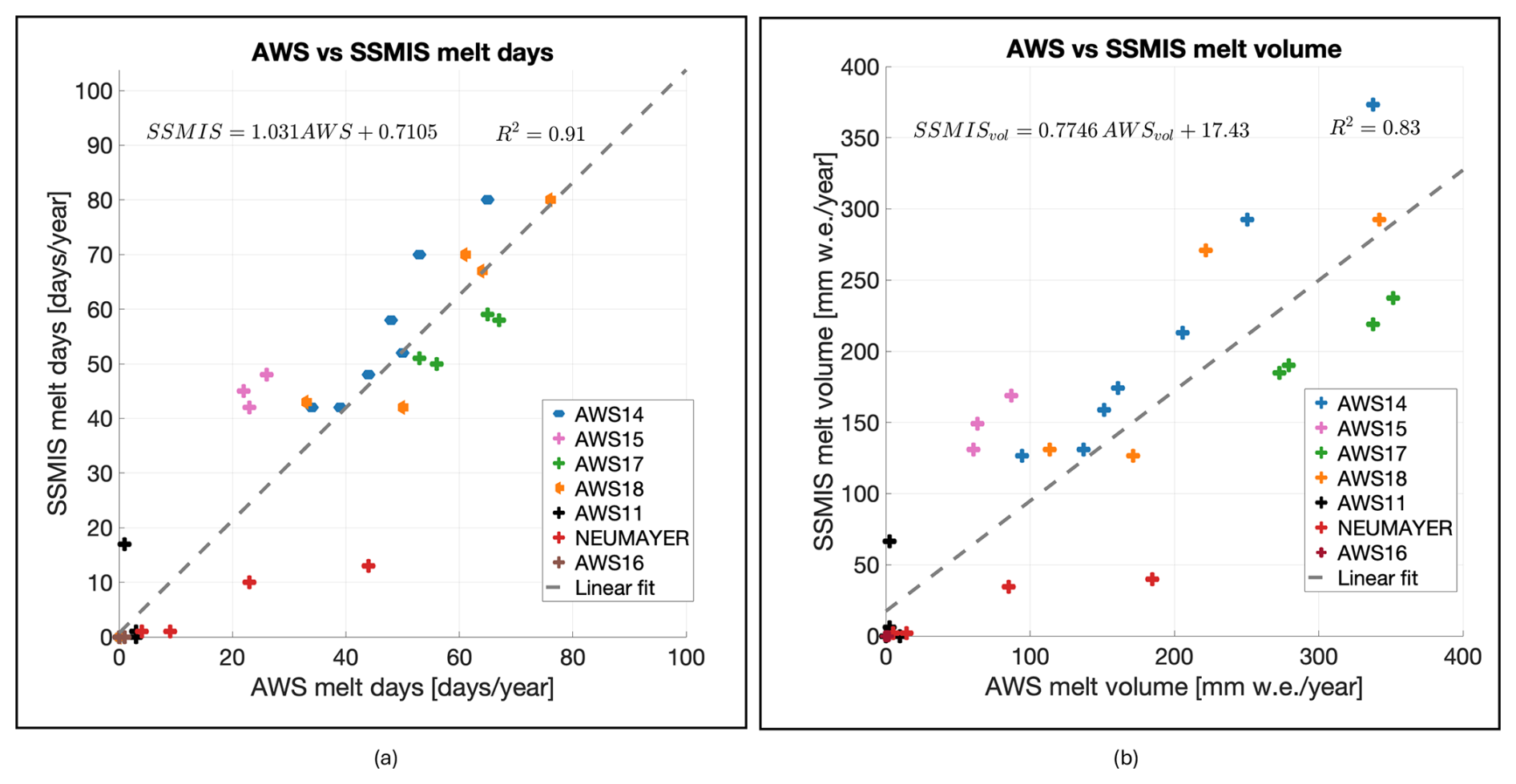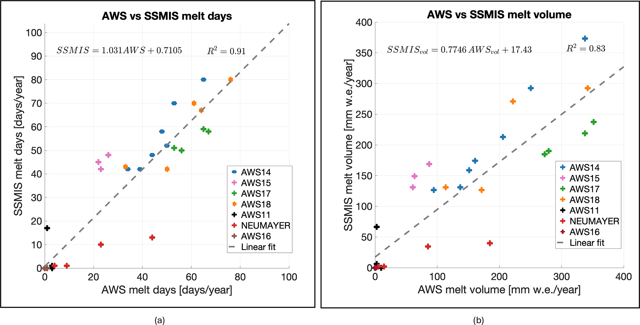 These three criteria were applied to each set of twice daily SSMIS overpasses for each pixel. A pixel is flagged as “melt” on day d if at least two thresholds are met. SMISS-derived annual melt-day counts are obtained by summing these daily flags per pixel over an Antarctic year (1 June to 31 May). A linear regression between AWS-derived and SSMIS-derived annual melt-day counts yielded a coefficient of determination of R2=0.91 (Fig. 1a).