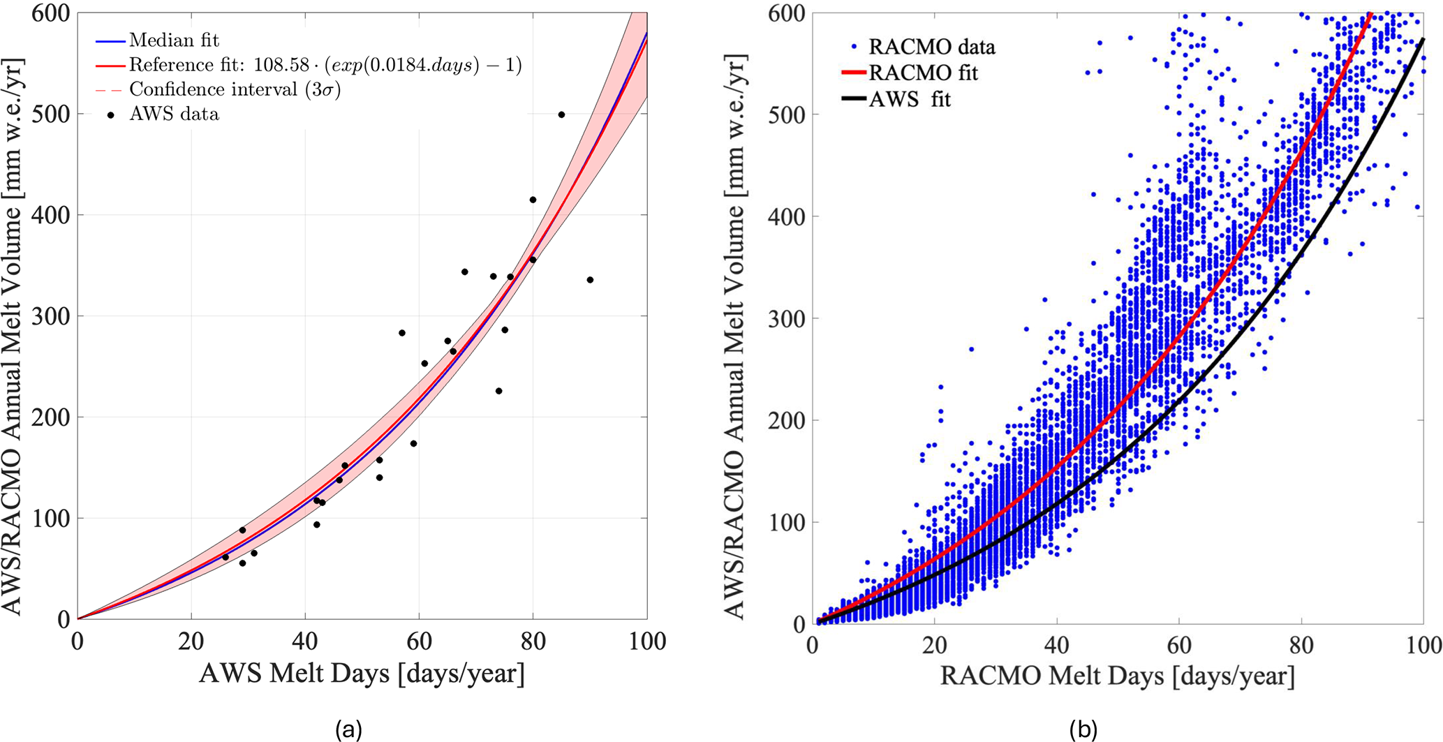 The second major step in the melt volume estimate is to relate the annual number of melt days (m) to total annual melt (M). To that end, we fitted the AWS-derived decadal record (2011–2021) to an exponential model: